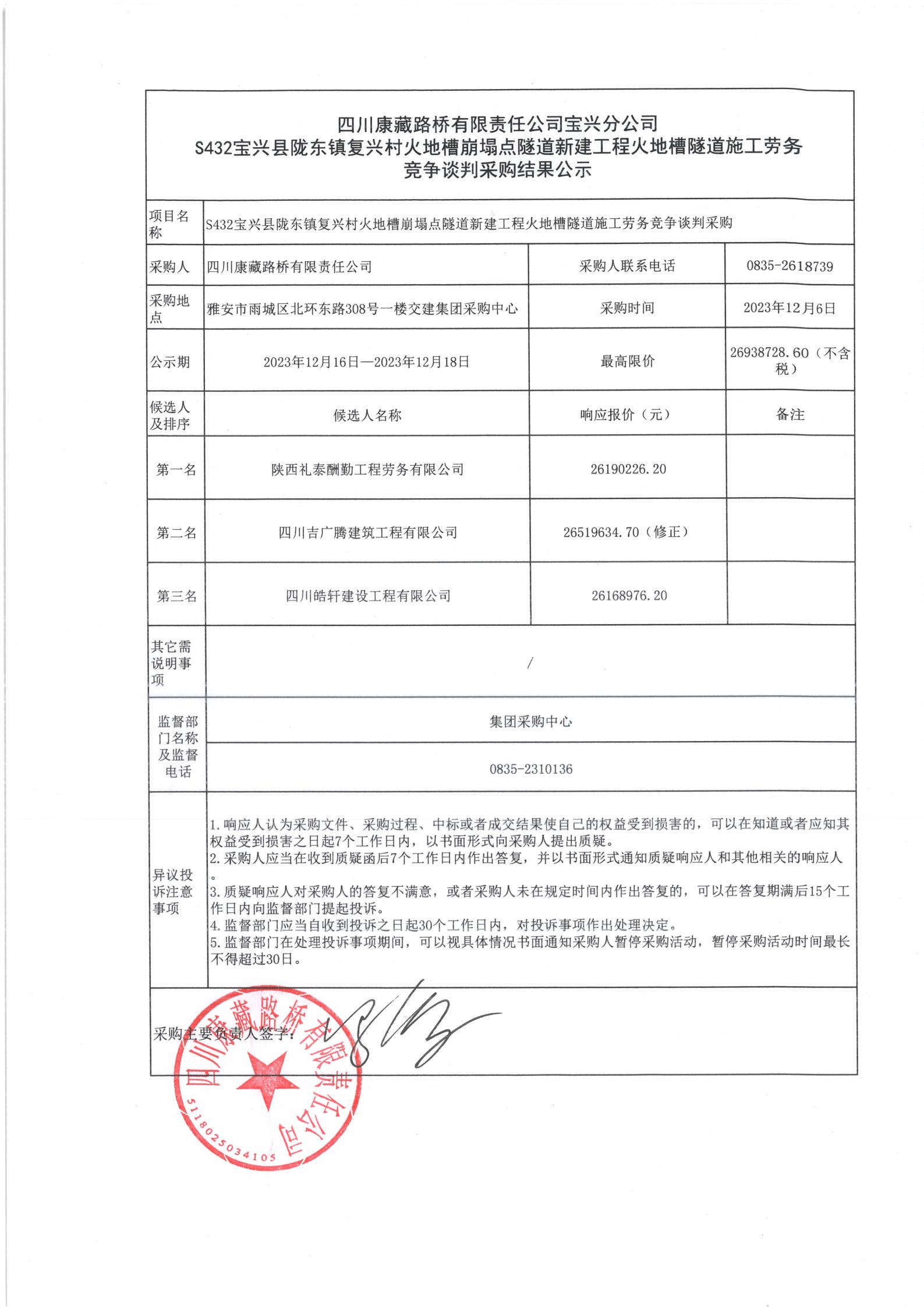 四川康藏路橋有限責(zé)任公司寶興分公司S432寶興縣隴東鎮(zhèn)復(fù)興村火地槽崩塌點(diǎn)隧道新建工程火地槽隧道施工勞務(wù)競爭談判采購結(jié)果公示