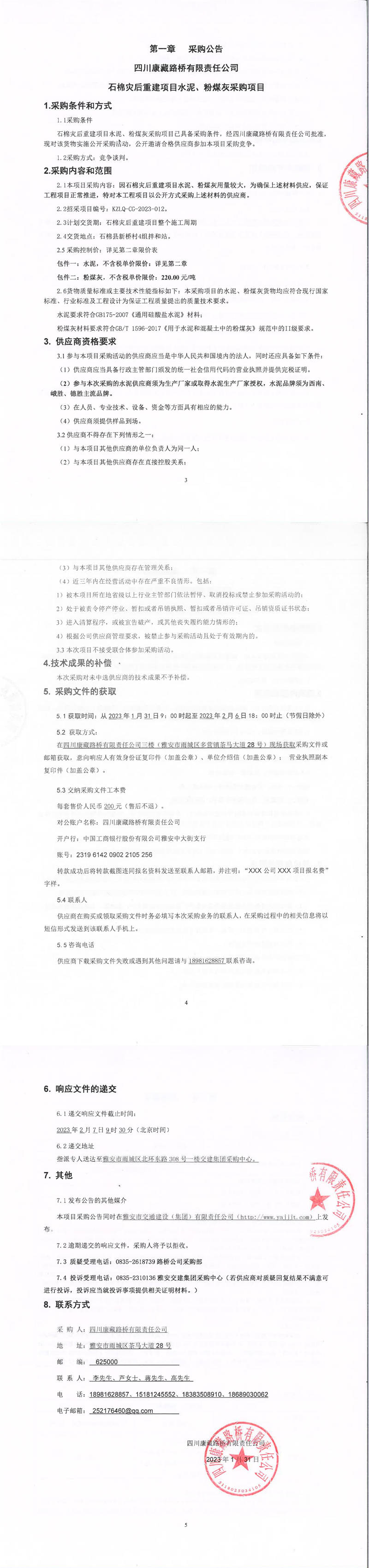 四川康藏路橋有限責(zé)任公司石棉災(zāi)后重建項(xiàng)目水泥、粉煤灰采購(gòu)項(xiàng)目采購(gòu)公告