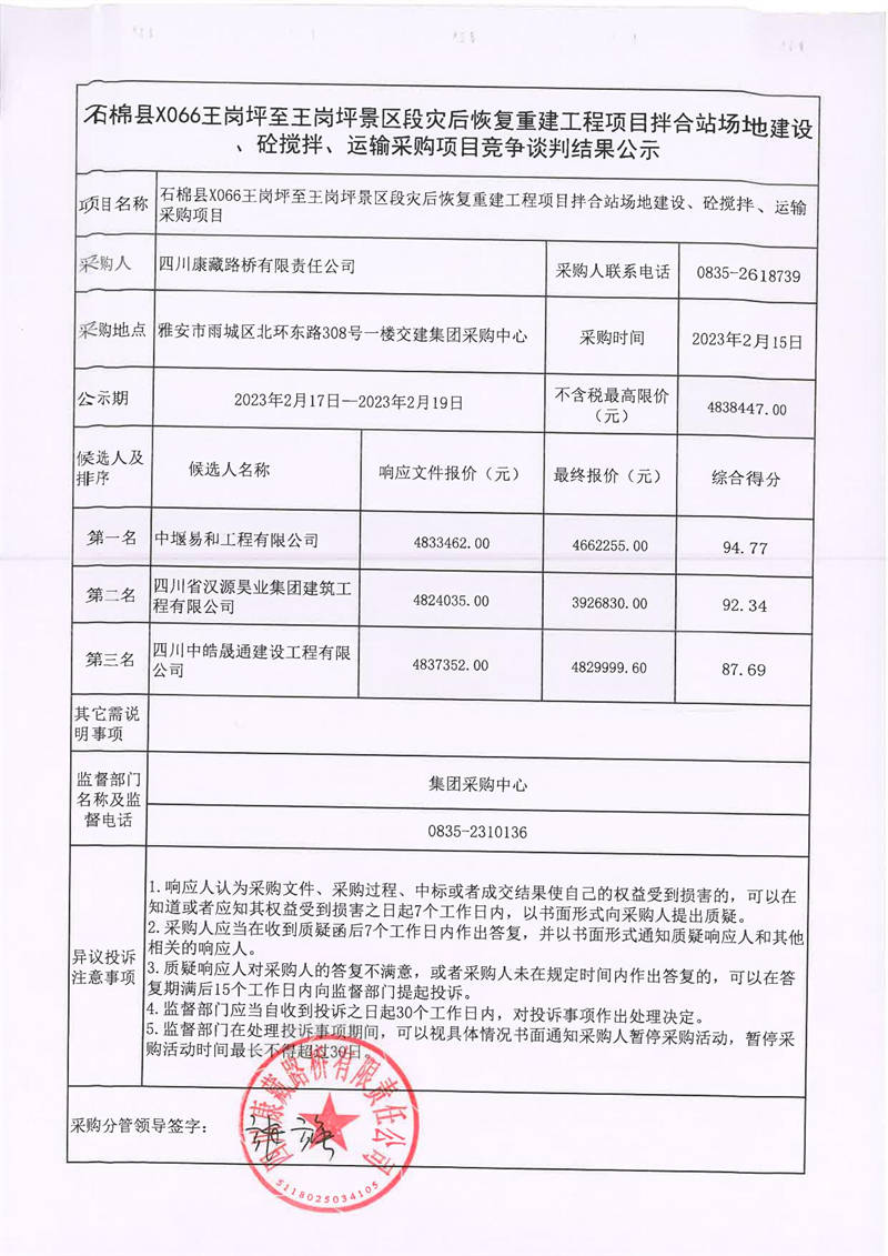 四川康藏路橋有限責(zé)任公司石棉縣X066王崗坪至王崗坪景區(qū)段災(zāi)后恢復(fù)重建工程項(xiàng)目拌合站場(chǎng)地建設(shè)、砼攪拌、運(yùn)輸采購(gòu)項(xiàng)目競(jìng)爭(zhēng)談判結(jié)果公示