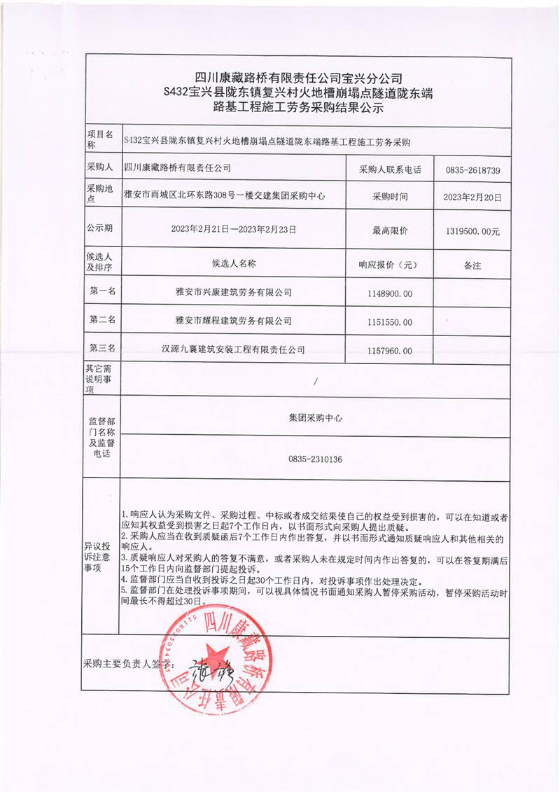 四川康藏路橋有限責任公司寶興分公司S432寶興縣隴東鎮(zhèn)復興村火地槽崩塌點隧道隴東端路基工程施工勞務采購結(jié)果公示