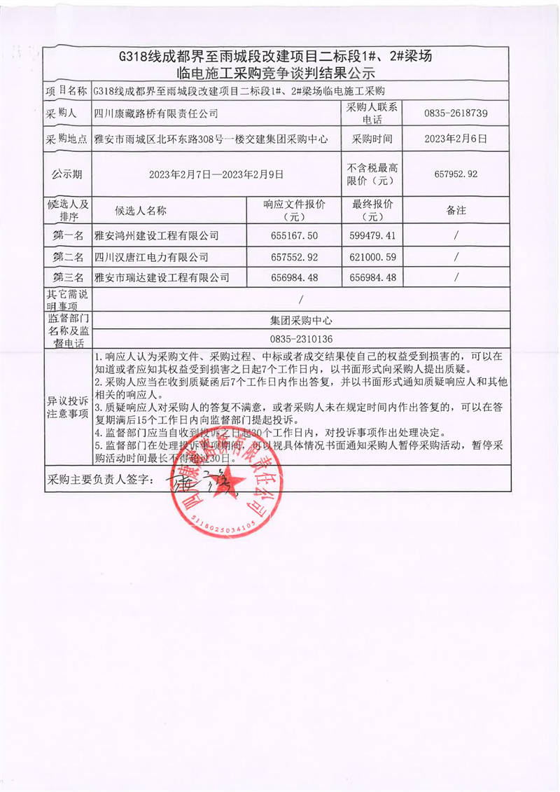 四川康藏路橋有限責(zé)任公司G318線成都界至雨城段改建項(xiàng)目二標(biāo)段1#、2#梁場臨電施工采購競爭談判結(jié)果公示