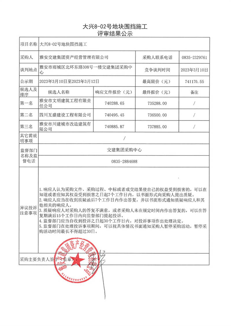 雅安交建集團(tuán)資產(chǎn)經(jīng)營管理有限公司大興8-02號(hào)地塊圍擋施工結(jié)果公示