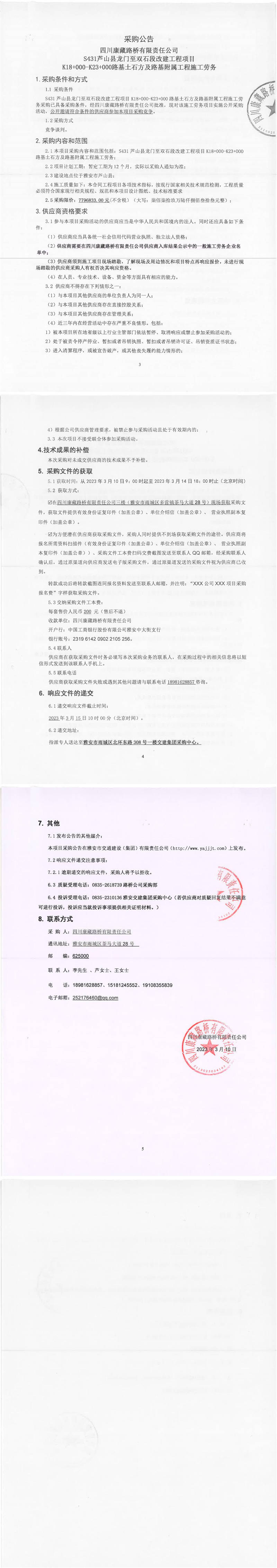 四川康藏路橋有限責(zé)任公司S431蘆山縣龍門至雙石段改建工程項(xiàng)目K18+000-K23+000路基土石方及路基附屬工程施工勞務(wù)采購(gòu)公告
