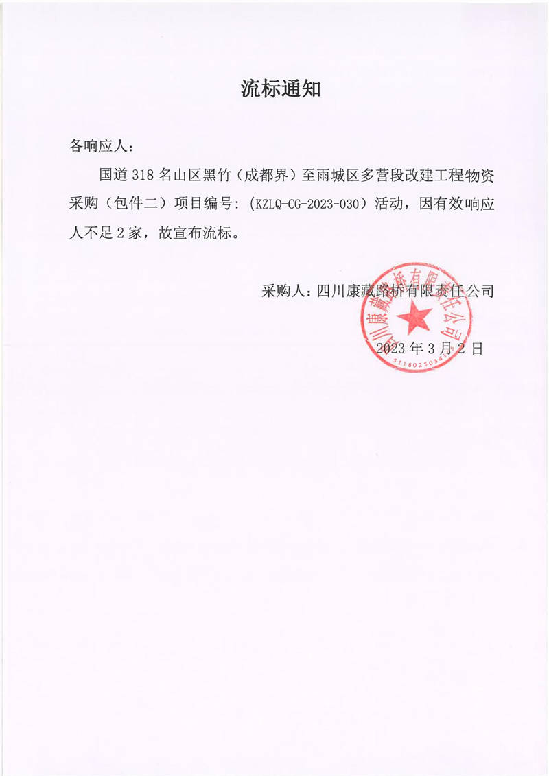 四川康藏路橋有限責(zé)任公司國(guó)道318名山區(qū)黑竹(成都界)至雨城區(qū)多營(yíng)段改建工程物資采購(gòu)包件2流標(biāo)通知
