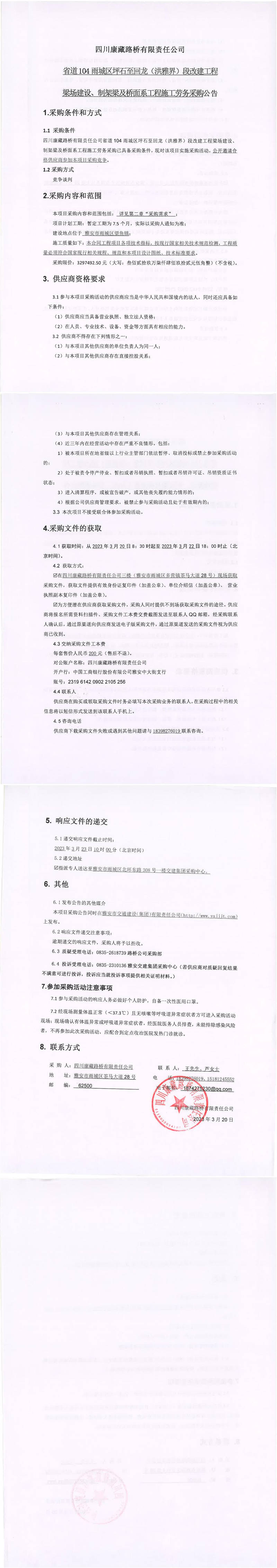 四川康藏路橋有限責任公司省道104雨城區(qū)坪石至回龍(洪雅界)段改建工程梁場建設、制架梁及橋面系工程施工勞務采購公告