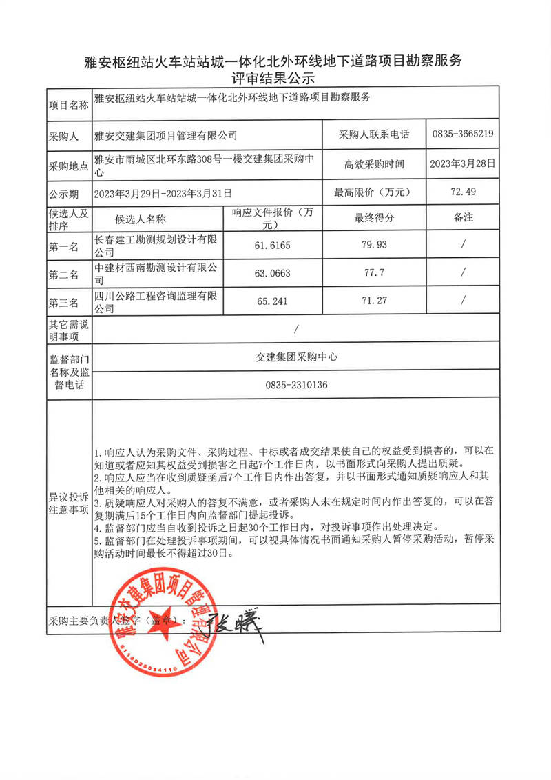 雅安交建集團(tuán)項目管理有限公司雅安樞紐站火車站站城一體化北外環(huán)線地下道路項目勘察服務(wù)評審結(jié)果公示