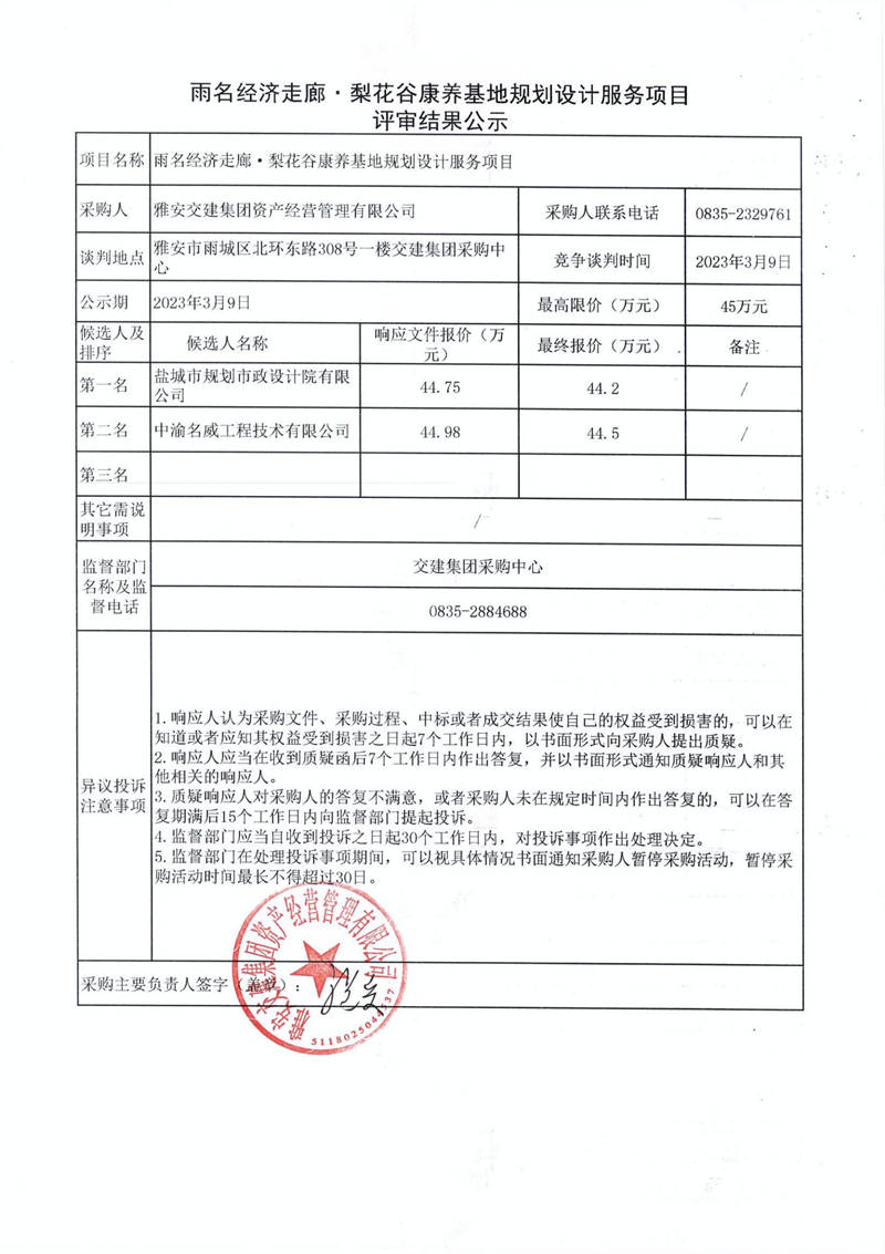 雅安交建集團資產(chǎn)經(jīng)營管理有限公司雨名經(jīng)濟走廊·梨花谷康養(yǎng)基地規(guī)劃設(shè)計服務(wù)項目采購結(jié)果公示