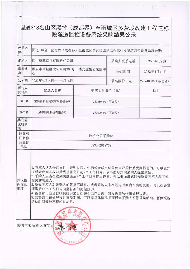四川康藏路橋有限責任公司國道318名山區(qū)黑竹(成都界)至雨城區(qū)多營段改建工程三標段隧道監(jiān)控設(shè)備系統(tǒng)采購結(jié)果公示