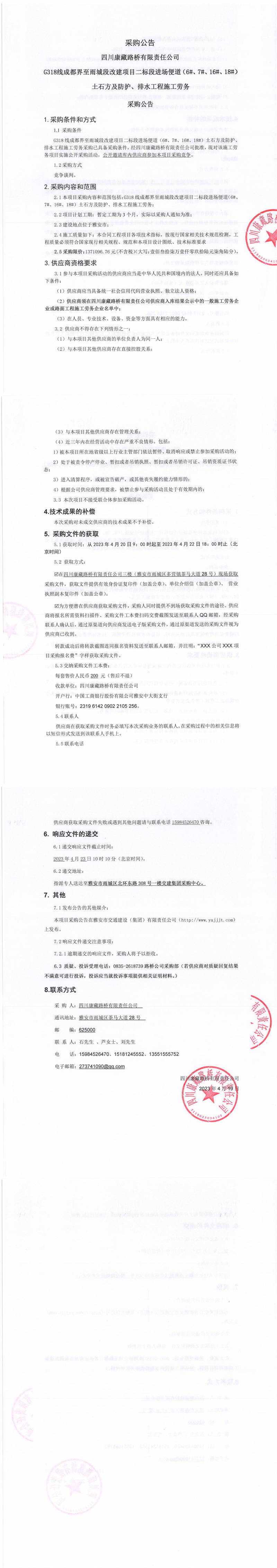 四川康藏路橋有限責(zé)任公司G318線成都至雨城段改建項(xiàng)目二標(biāo)段進(jìn)場(chǎng)便道(6#、7#、16#、18#)土石方及防護(hù)、排水工程施工勞務(wù)