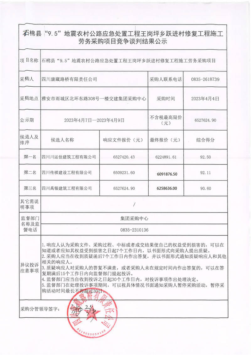 四川康藏路橋有限責任公司石棉縣“9.5”地震農(nóng)村公路應(yīng)急處置工程王崗坪鄉(xiāng)躍進村修復工程施工勞務(wù)采購項目競爭談判結(jié)果公示