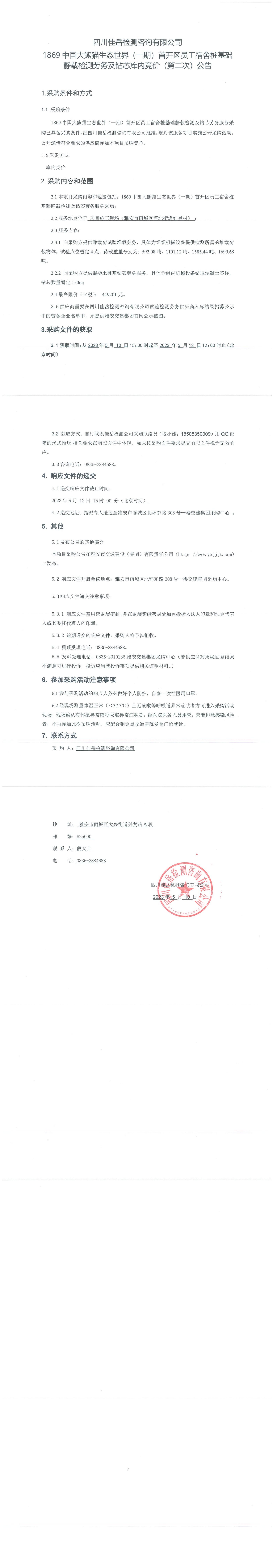 四川佳岳檢測(cè)咨詢(xún)有限公司1869中國(guó)大熊貓生態(tài)世界(一期)首開(kāi)區(qū)員工宿舍樁基礎(chǔ)靜載檢測(cè)勞務(wù)及磚芯庫(kù)內(nèi)競(jìng)價(jià)(第二次)采購(gòu)公告