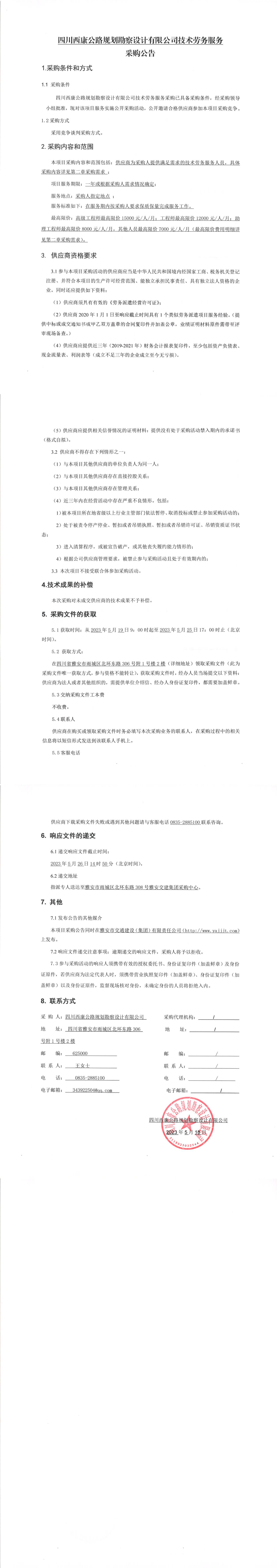 四川西康公路規(guī)劃勘察設(shè)計(jì)有限公司技術(shù)勞務(wù)服務(wù)采購(gòu)公告
