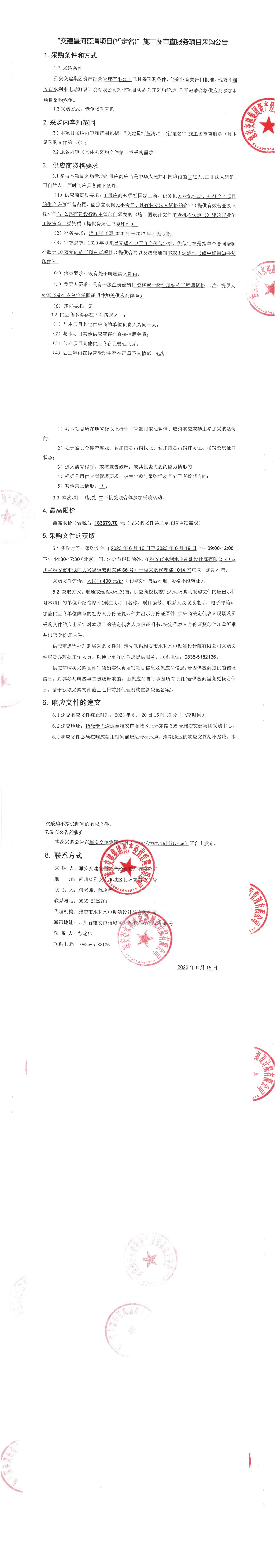 雅安交建集團資產經營管理有限公司“交建星河藍灣項目(暫定名)”施工圖審查服務項目采購公告