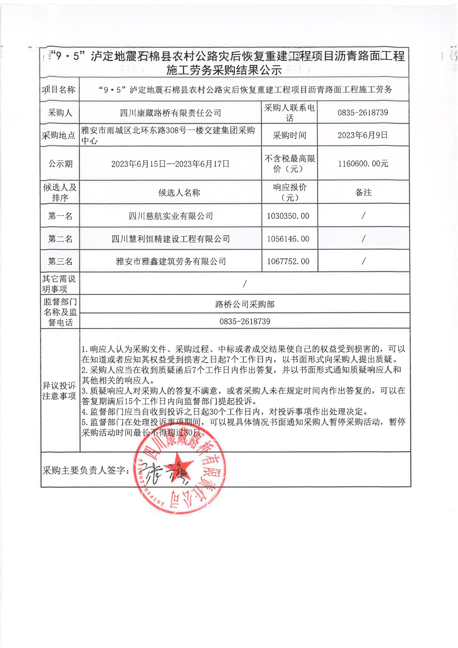 四川康藏路橋有限責(zé)任公司“9·5”瀘定地震石棉縣農(nóng)村公路災(zāi)后恢復(fù)重建工程項目瀝青路面工程施工勞務(wù)采購結(jié)果公示