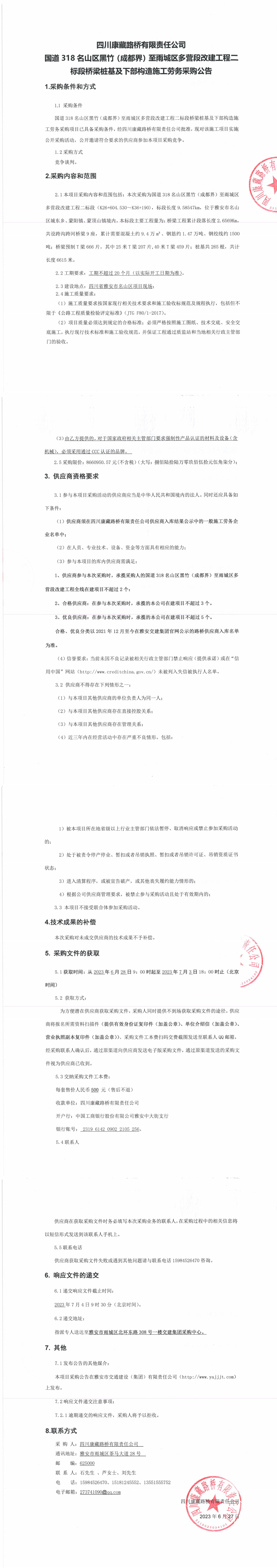 四川康藏路橋有限責任公司國道318名山區(qū)黑竹(成都界)至雨城區(qū)多營段改建工程二標段橋梁樁基及下部構(gòu)造施工勞務(wù)采購公告