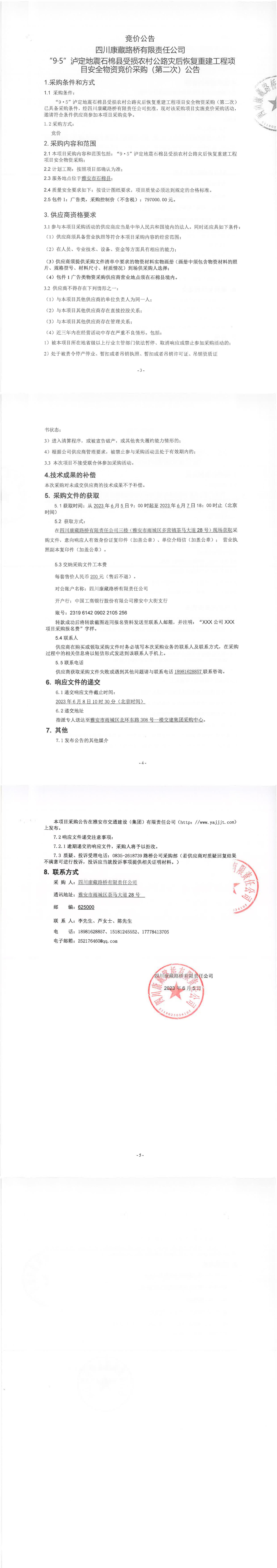 四川康藏路橋有限責任公司“9·5”瀘定地震石棉縣受損農(nóng)村公路災(zāi)后恢復(fù)重建工程項目安全物資競價采購(第二次)公告