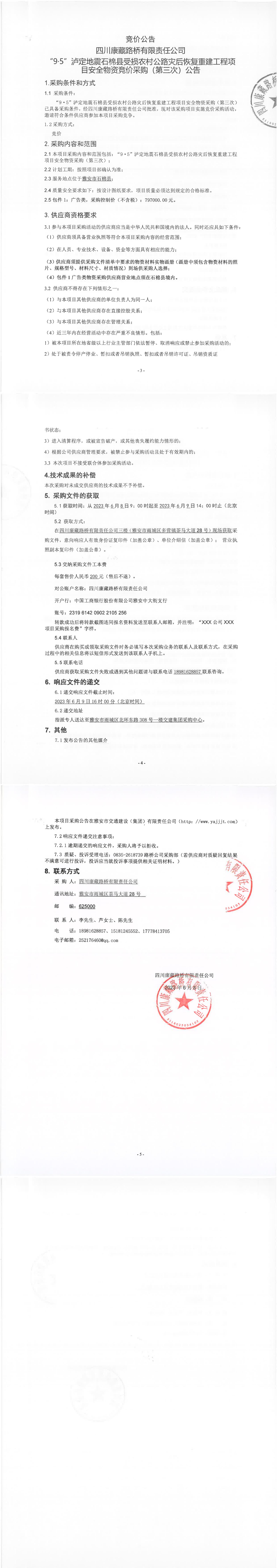 四川康藏路橋有限責(zé)任公司“9·5”瀘定地震石棉縣受損農(nóng)村公路災(zāi)后恢復(fù)重建工程項目安全物資競價采購(第三次)公告