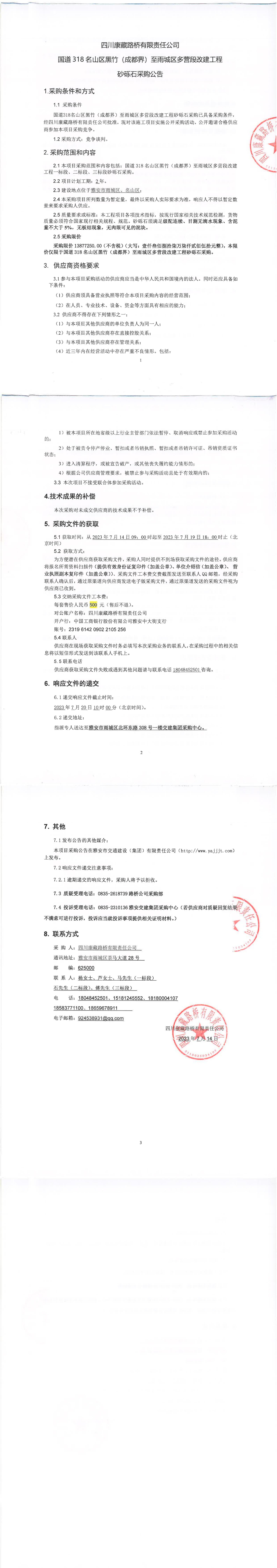 四川康藏路橋有限責(zé)任公司國道318名山區(qū)黑竹(成都界)至雨城區(qū)多營(yíng)段改建工程砂礫石采購公告