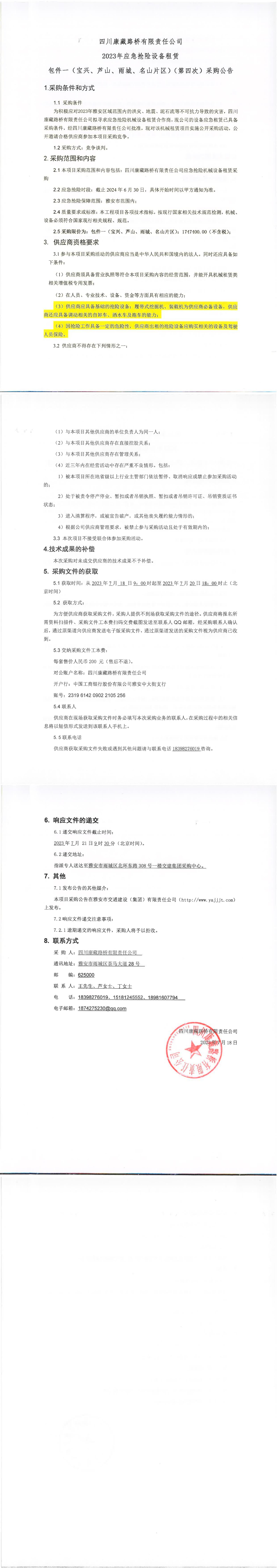 四川康藏路橋有限責(zé)任公司2023年應(yīng)急搶險(xiǎn)設(shè)備租賃包件一(寶興、蘆山、雨城、名山片區(qū))(第四次)采購公告