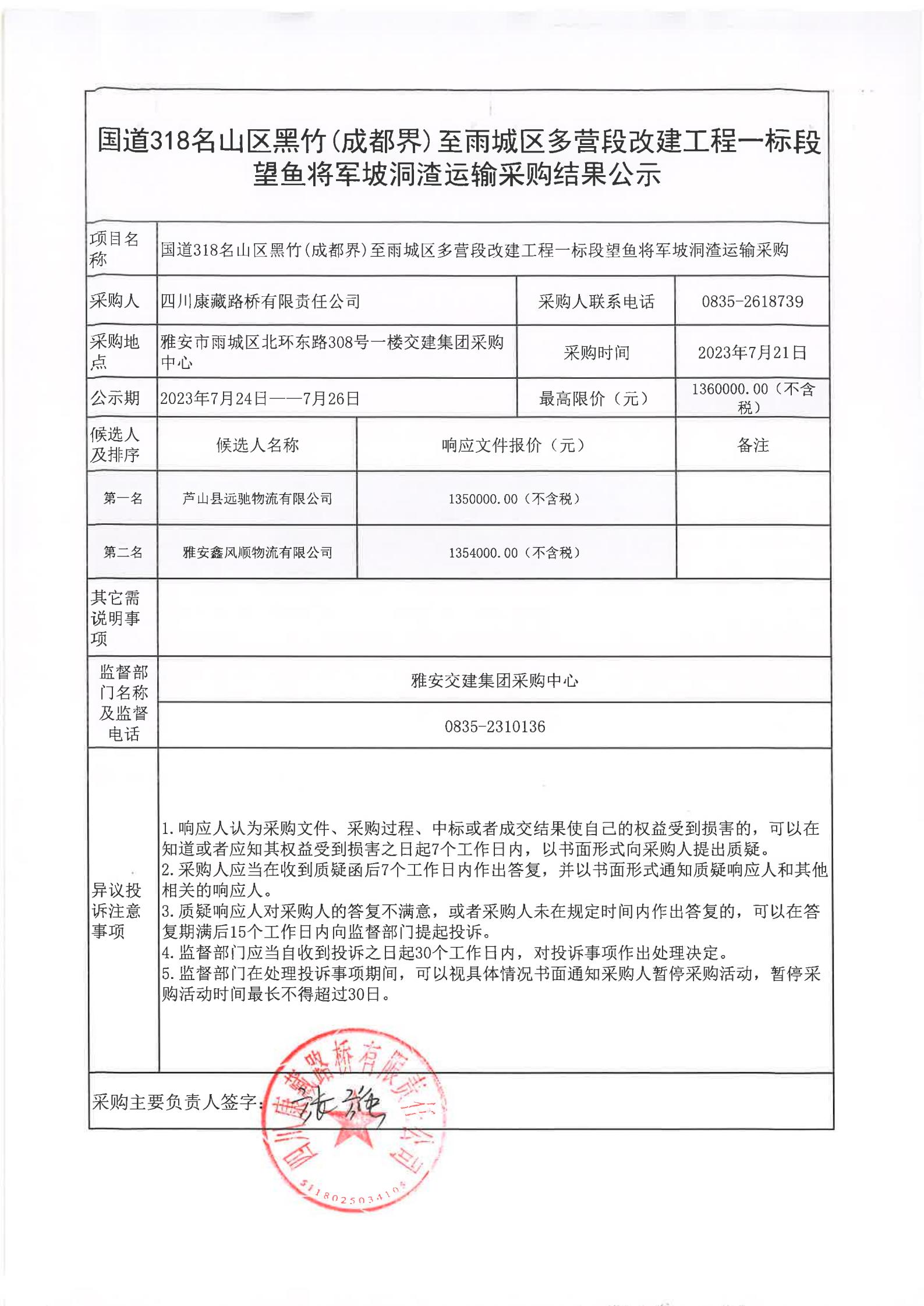 四川康藏路橋有限責(zé)任公司國道318名山區(qū)黑竹(成都界)至雨城區(qū)多營段改建工程一標(biāo)段望魚將軍坡洞渣運輸采購結(jié)果公示