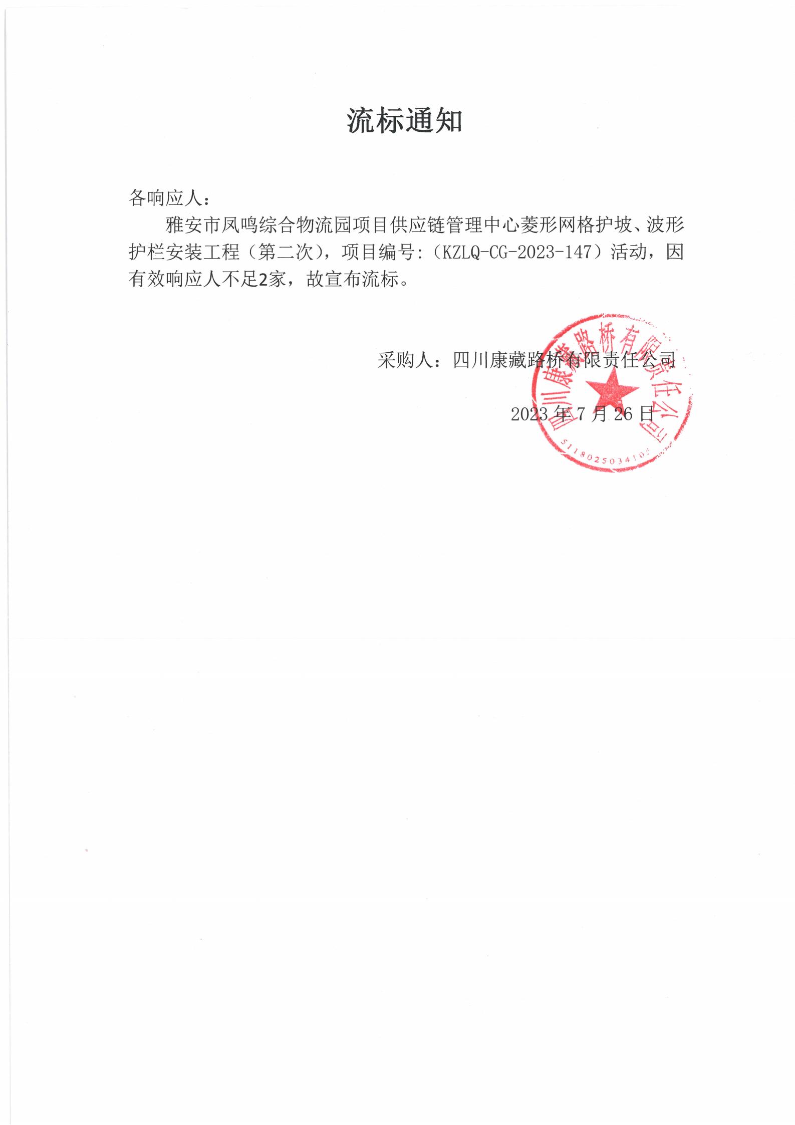 四川康藏路橋有限責任公司雅安市鳳鳴綜合物流園項目供應鏈管理中心菱形網(wǎng)格護坡、波形護欄安裝工程(第二次)流標通知