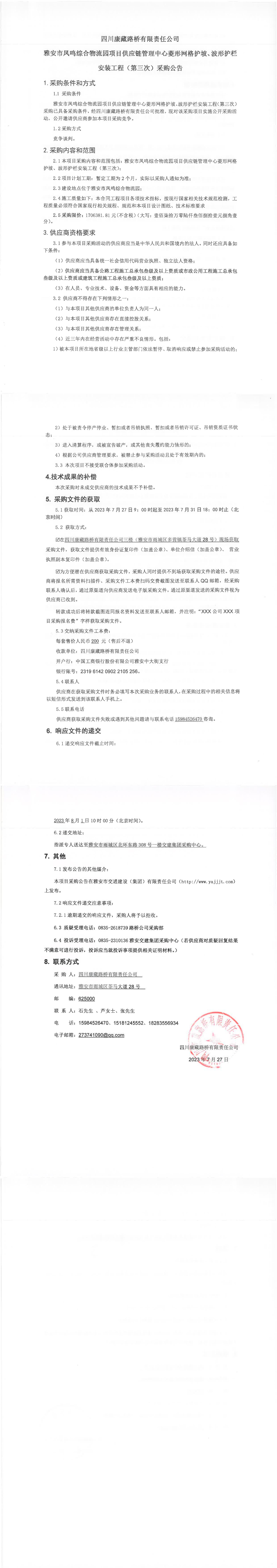四川康藏路橋有限責(zé)任公司雅安市鳳鳴綜合物流園項目供應(yīng)鏈管理中心菱形網(wǎng)格護(hù)坡、波形護(hù)欄安裝工程(第三次)采購公告