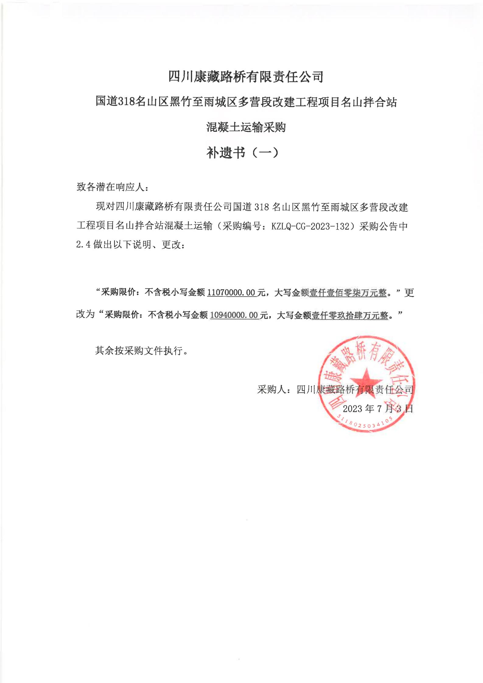 四川康藏路橋有限責(zé)任公司國(guó)道318名山區(qū)黑竹至雨城區(qū)多營(yíng)段改建工程項(xiàng)目名山拌合站混凝土運(yùn)輸服務(wù)采購(gòu)補(bǔ)遺書