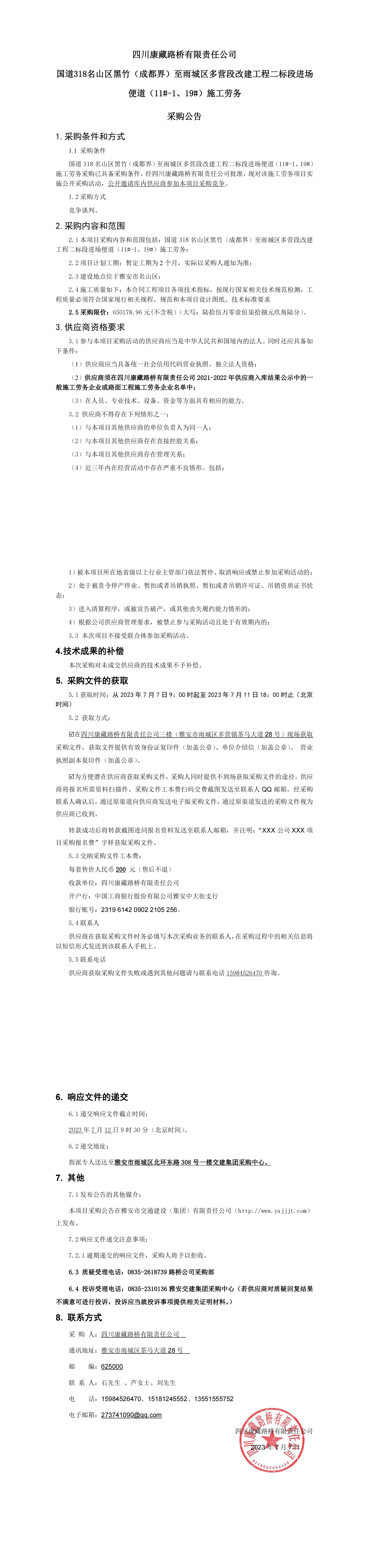 四川康藏路橋有限責(zé)任公司國道318名山區(qū)黑竹(成都界)至雨城區(qū)多營段改建工程二標(biāo)段進(jìn)場便道(11#-1、19#)施工勞務(wù)采購公告