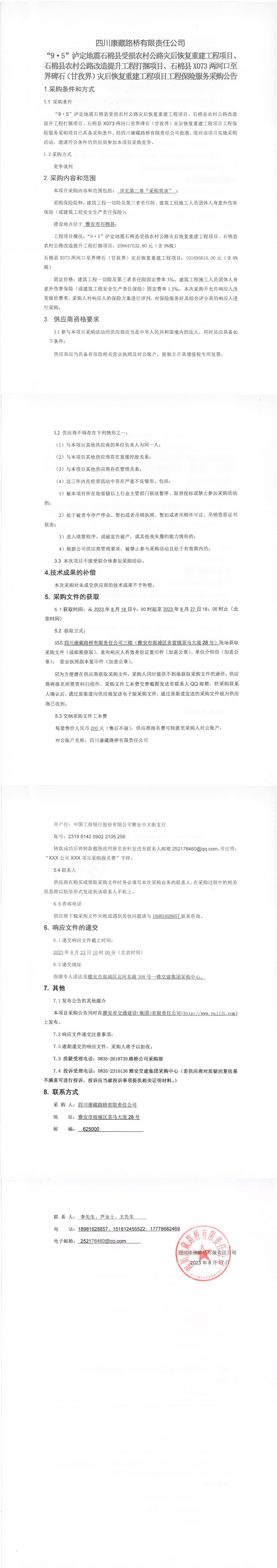 四川康藏路橋有限責任公司“9·5”瀘定地震石棉縣受損農(nóng)村公路災(zāi)后恢復(fù)重建工程項目、石棉縣農(nóng)村公路改造提升工程打捆項目、石棉縣X073兩河口至界碑石(甘孜界)災(zāi)后恢復(fù)重建工程項目工程保險服務(wù)采購公告