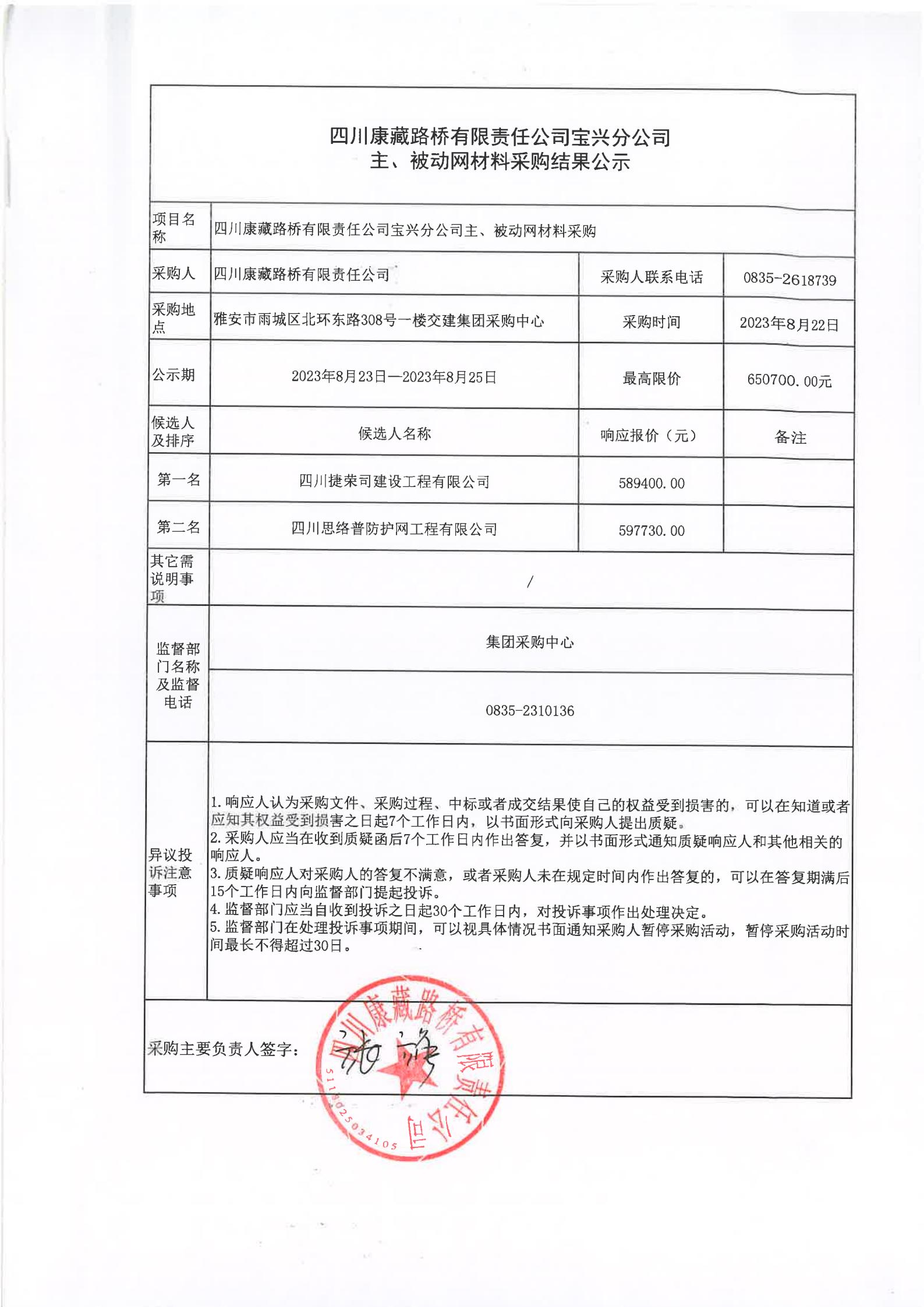 四川康藏路橋有限責(zé)任公司寶興分公司主、被動(dòng)網(wǎng)材料采購(gòu)結(jié)果公示