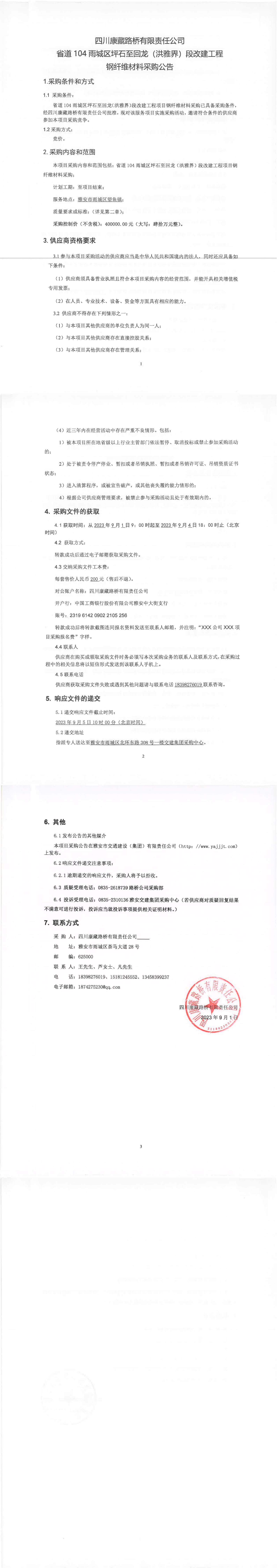 四川康藏路橋有限責(zé)任公司省道104雨城區(qū)坪石至回龍(洪雅界)段改建工程鋼纖維材料采購公告