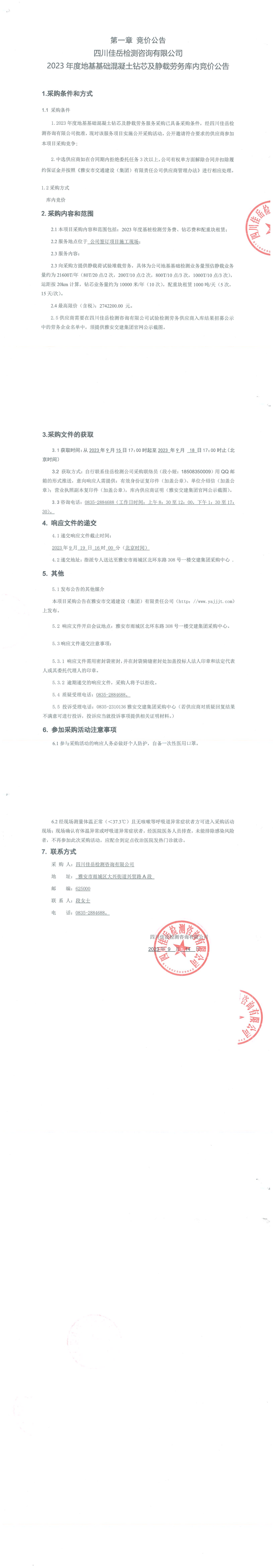 四川佳岳檢測咨詢有限公司2023年度地基基礎(chǔ)混凝土鉆芯及靜載勞務(wù)庫內(nèi)競價公告