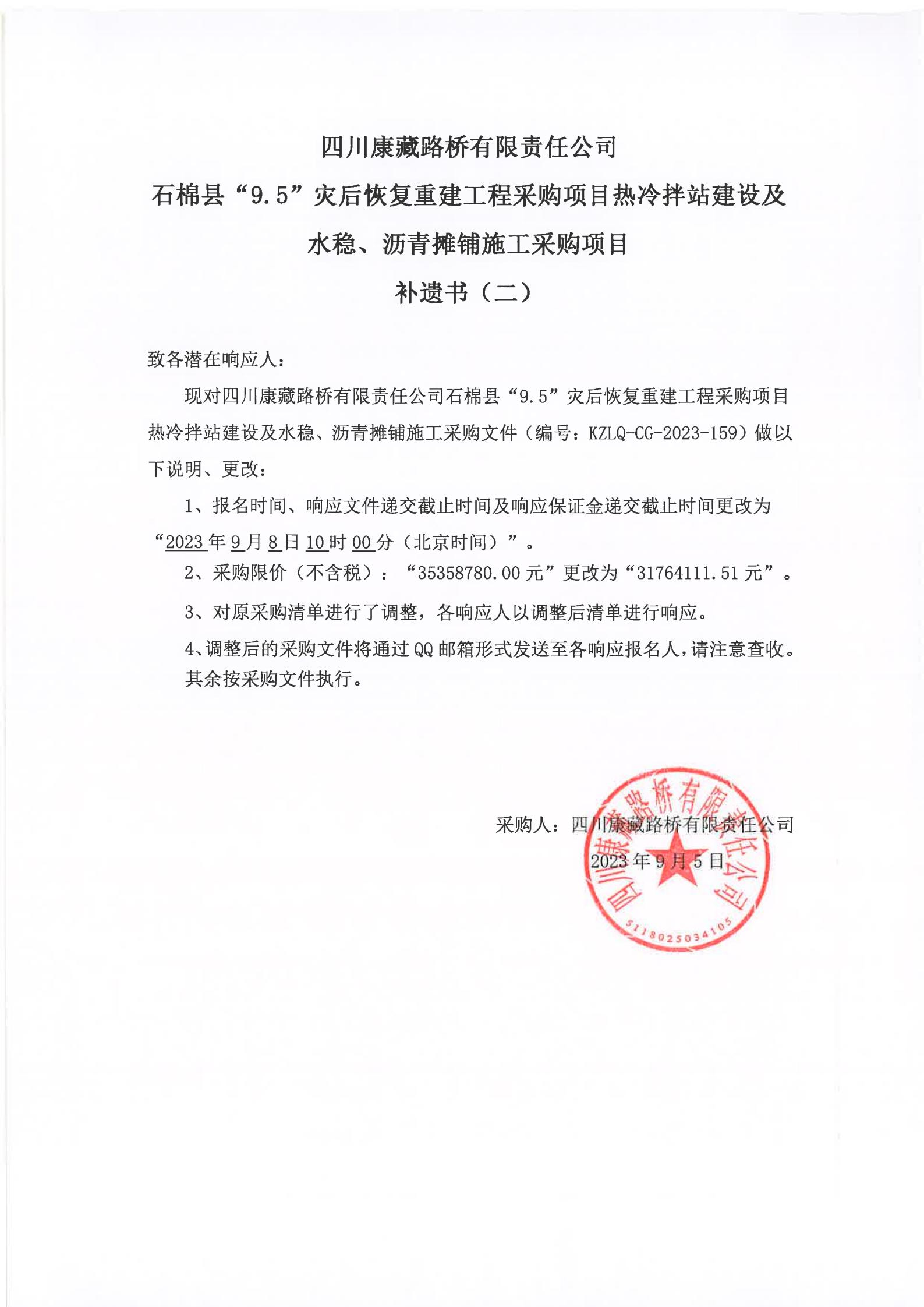 四川康藏路橋有限責任公司石棉縣“9·5”災后恢復重建工程采購項目熱冷拌站建設及水穩(wěn)、瀝青攤鋪施工采購項目補遺書(二)