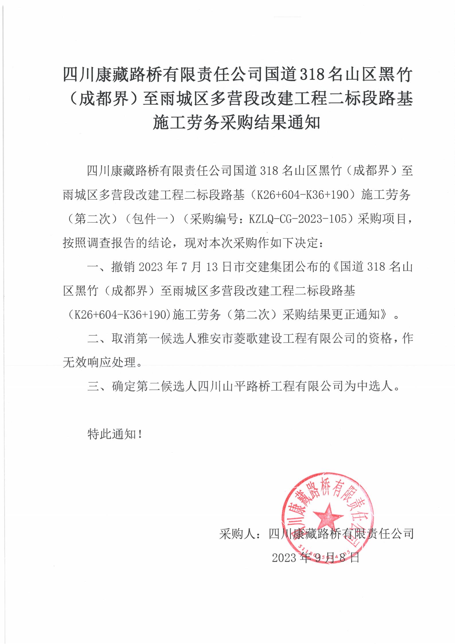 四川康藏路橋有限責(zé)任公司國道318名山區(qū)黑竹(成都界)至雨城區(qū)多營段改建工程二標(biāo)段路基施工勞務(wù)采購結(jié)果通知