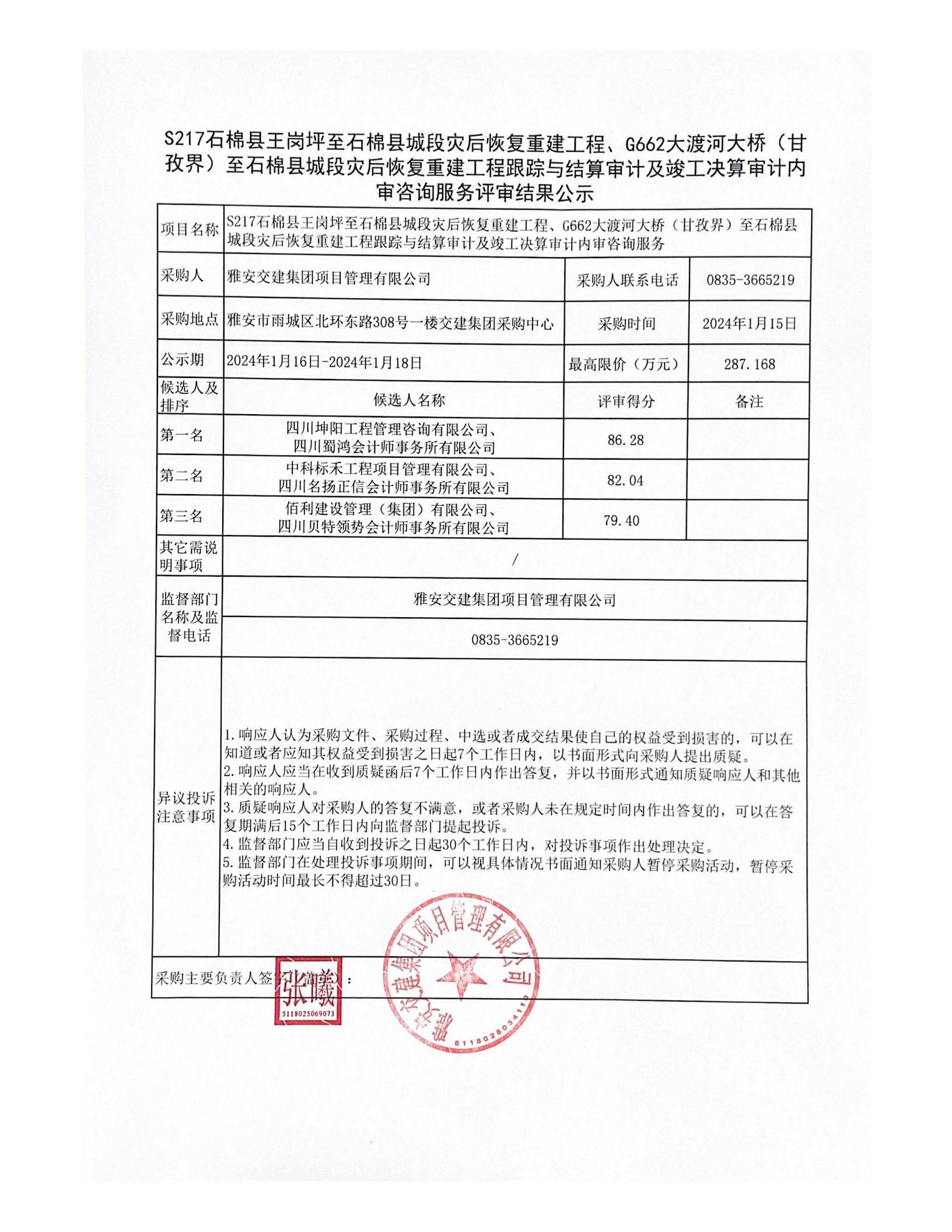 雅安交建集團(tuán)項(xiàng)目管理有限公司S217石棉縣王崗坪至石棉縣城段災(zāi)后恢復(fù)重建工程、G662大渡河大橋(甘孜界)至石棉縣城段災(zāi)后恢復(fù)重建工程跟蹤與結(jié)算審計(jì)及竣工決算審計(jì)內(nèi)審咨詢(xún)服務(wù)評(píng)審結(jié)果公示