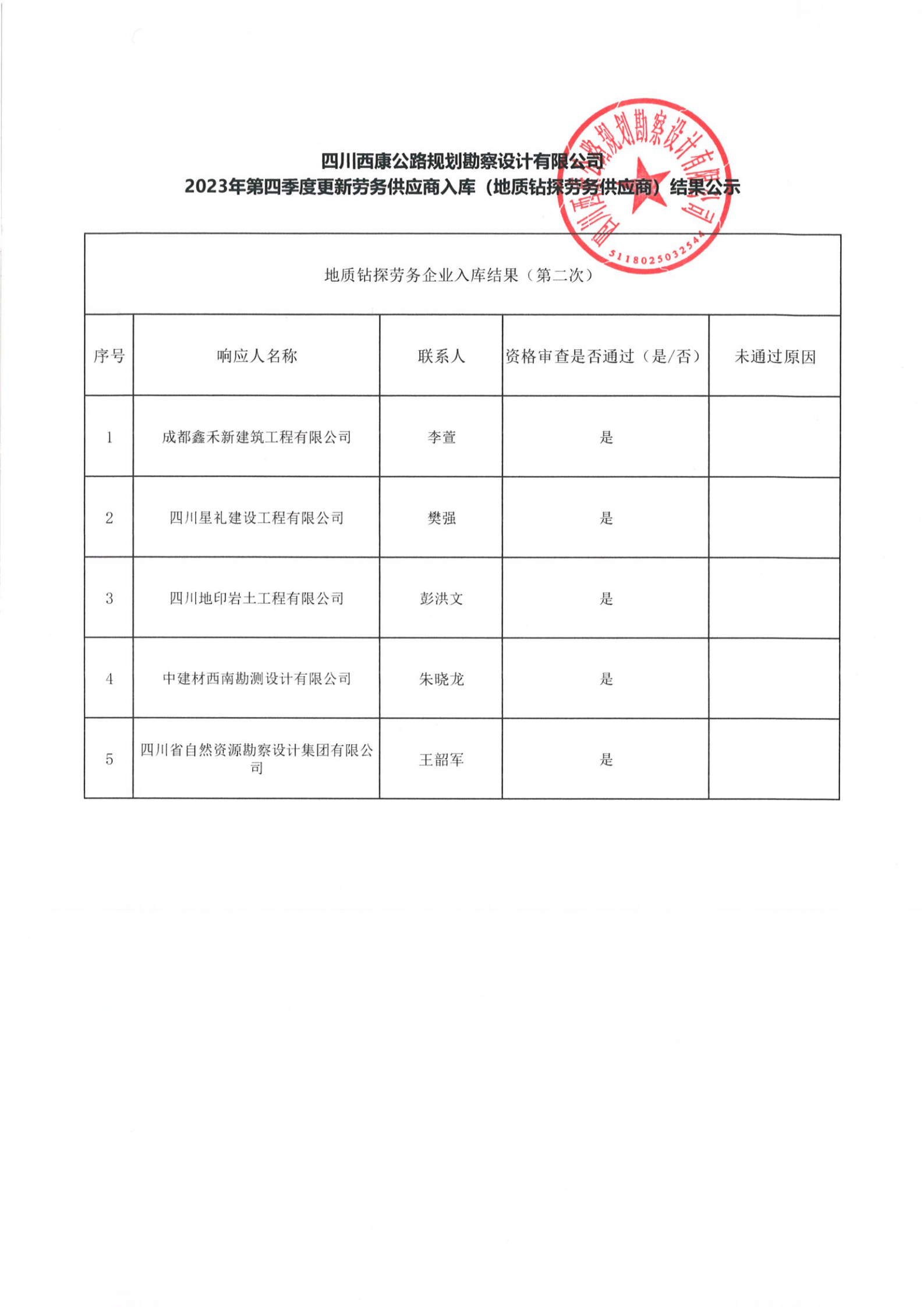 四川西康公路規(guī)劃勘察設計有限公司2023年第四季度更新勞務供應入庫 (地質鉆探勞務供應商)結果公示