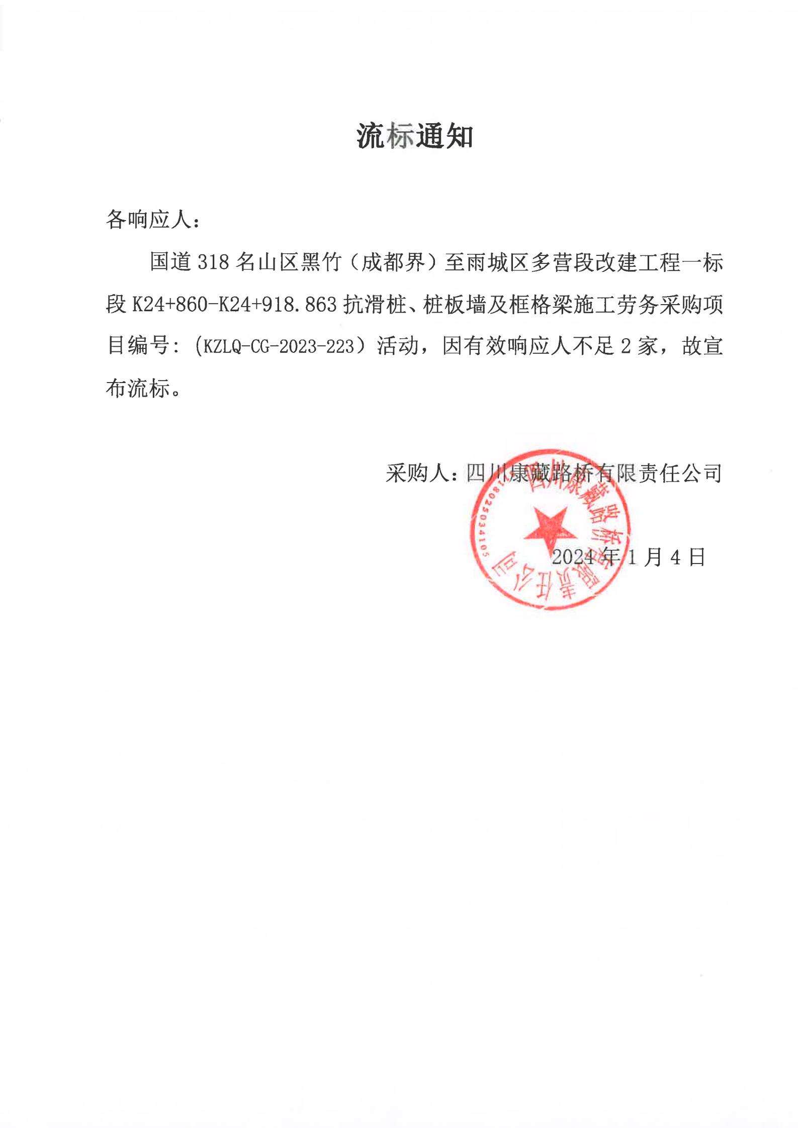 四川康藏路橋有限責任公司國道318名山區(qū)黑竹(成都界)至雨城區(qū)多營段改建工程一標段K24+860-K24+918.863抗滑樁、樁板墻及框格梁施工勞務(wù)采購項目流標通知