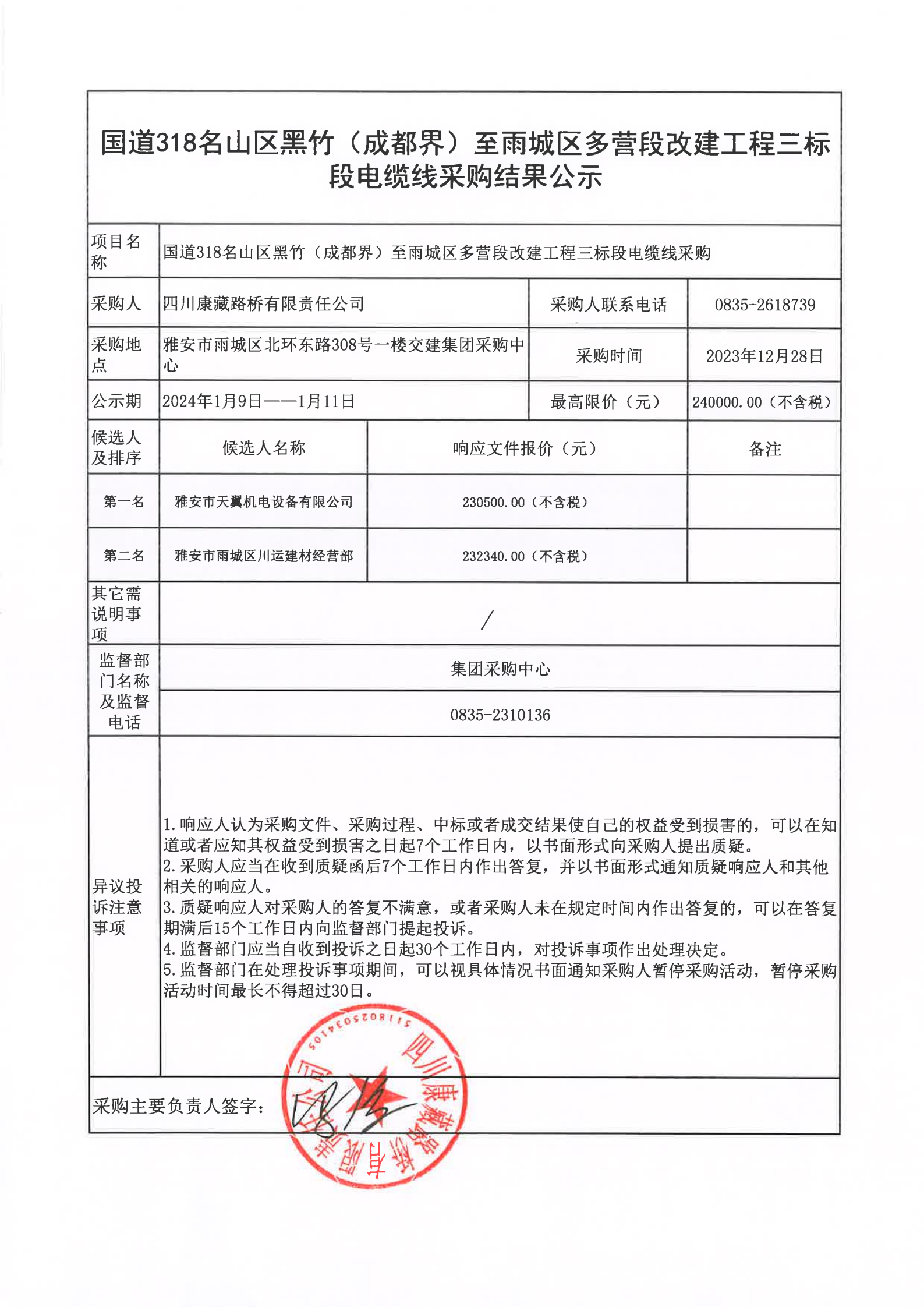 四川康藏路橋有限責(zé)任公司國道318名山區(qū)黑竹(成都界)至雨城區(qū)多營段改建工程三標(biāo)段電纜線采購結(jié)果公示