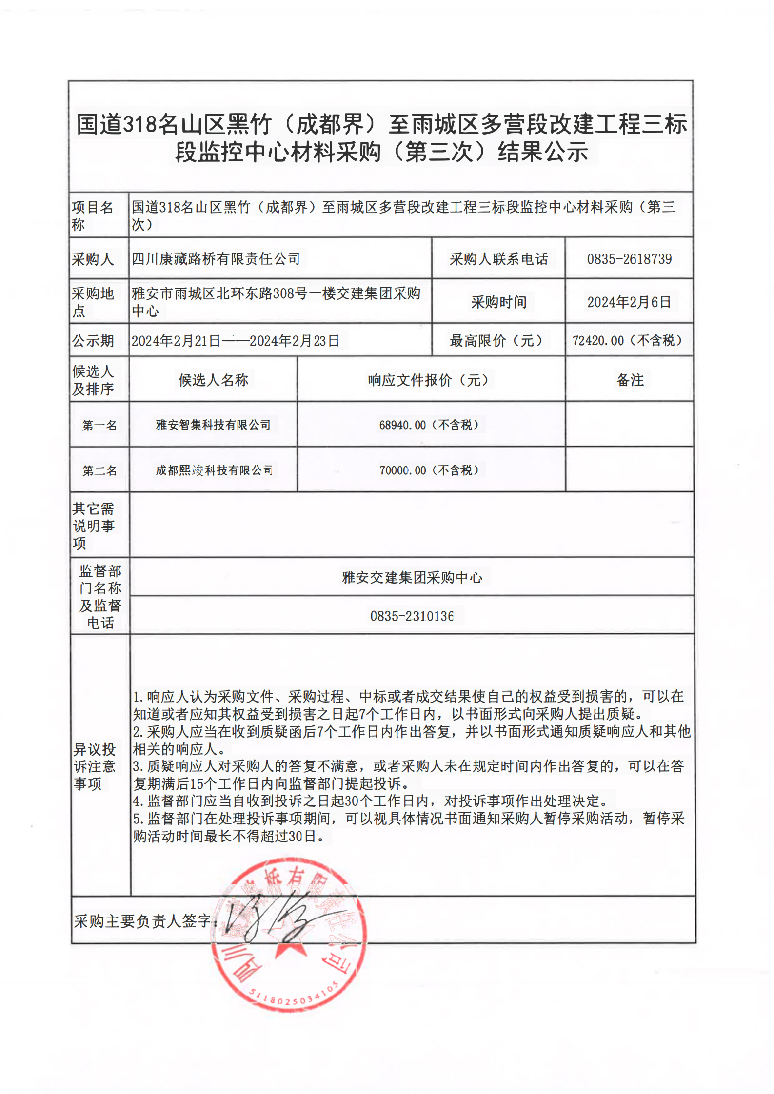 四川康藏路橋有限責(zé)任公司國道318名山區(qū)黑竹(成都界)至雨城區(qū)多營段改建工程三標(biāo)段監(jiān)控中心材料采購(第三次)結(jié)果公示