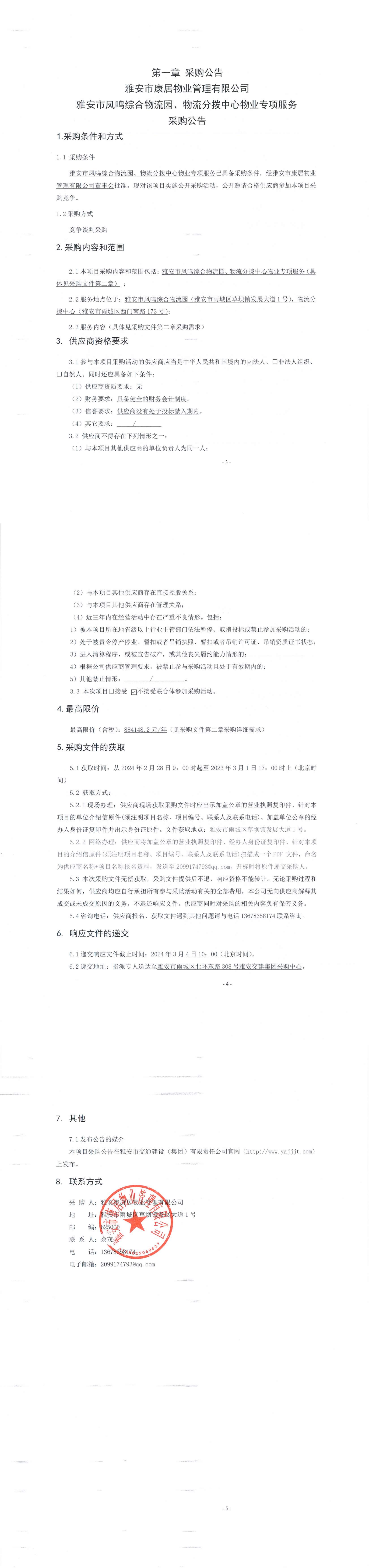 雅安市康居物業(yè)管理有限公司雅安市鳳鳴綜合物流園、物流分撥中心物業(yè)專項(xiàng)服務(wù)采購公告