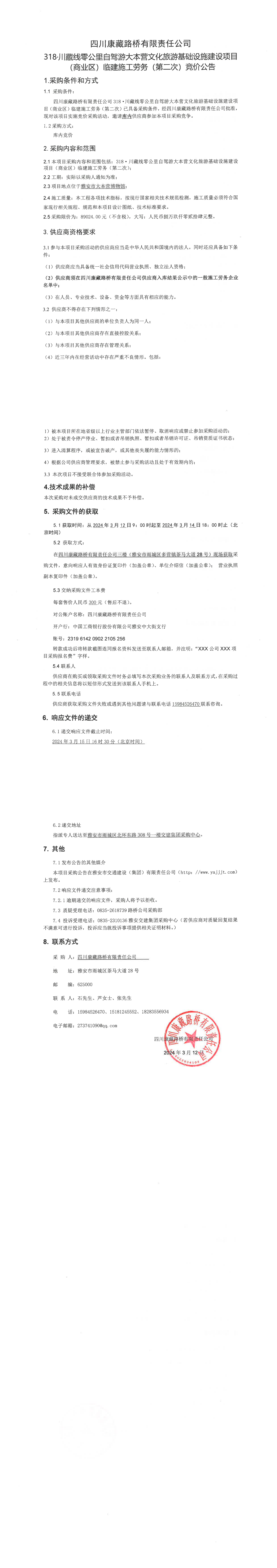 四川康藏路橋有限責(zé)任公司318·川藏公路零公里自駕游大本營文化旅游基礎(chǔ)設(shè)施建設(shè)項(xiàng)目(商業(yè)區(qū))臨建施工勞務(wù)(第二次)競(jìng)價(jià)公告