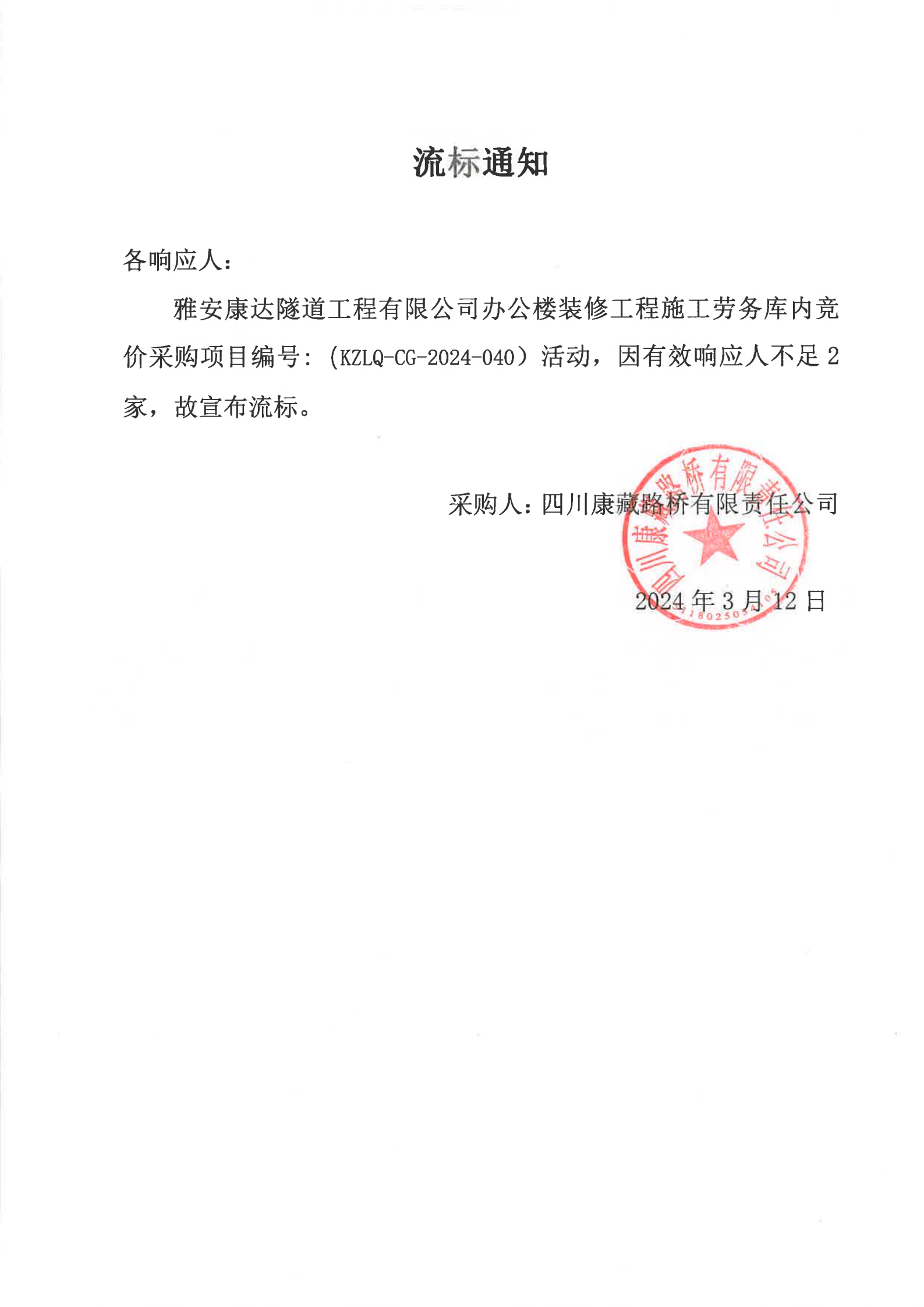 雅安康達隧道工程有限公司辦公樓裝修工程施工勞務庫內競價采購流標通知