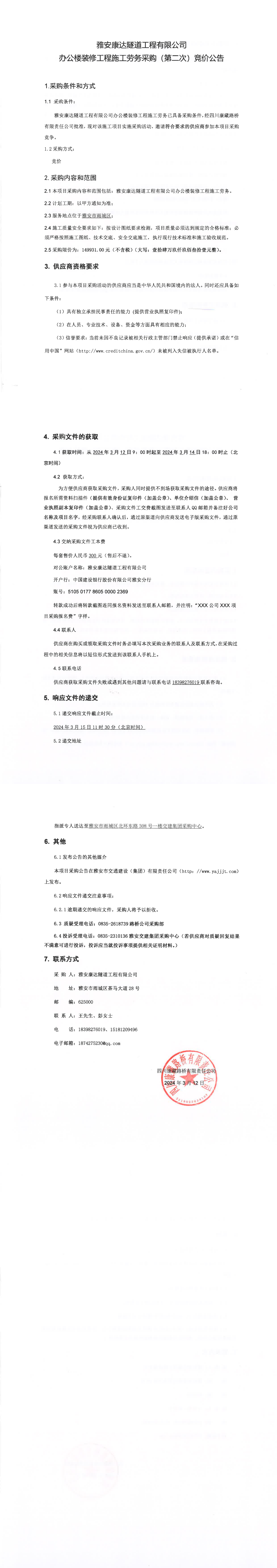 雅安康達(dá)隧道工程有限公司辦公樓裝修工程施工勞務(wù)競價(jià)采購(第二次)公告