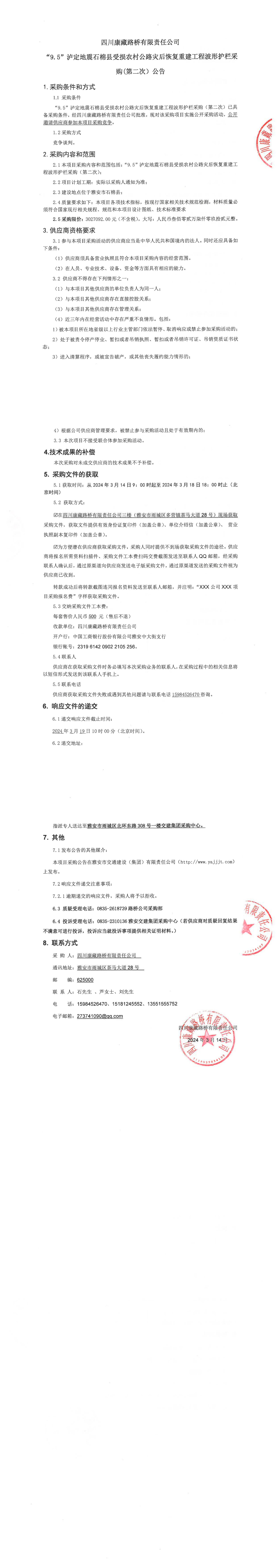 四川康藏路橋有限責(zé)任公司“9.5”瀘定地震石棉縣受損農(nóng)村公路災(zāi)后恢復(fù)重建工程波形護(hù)欄采購(第二次)公告