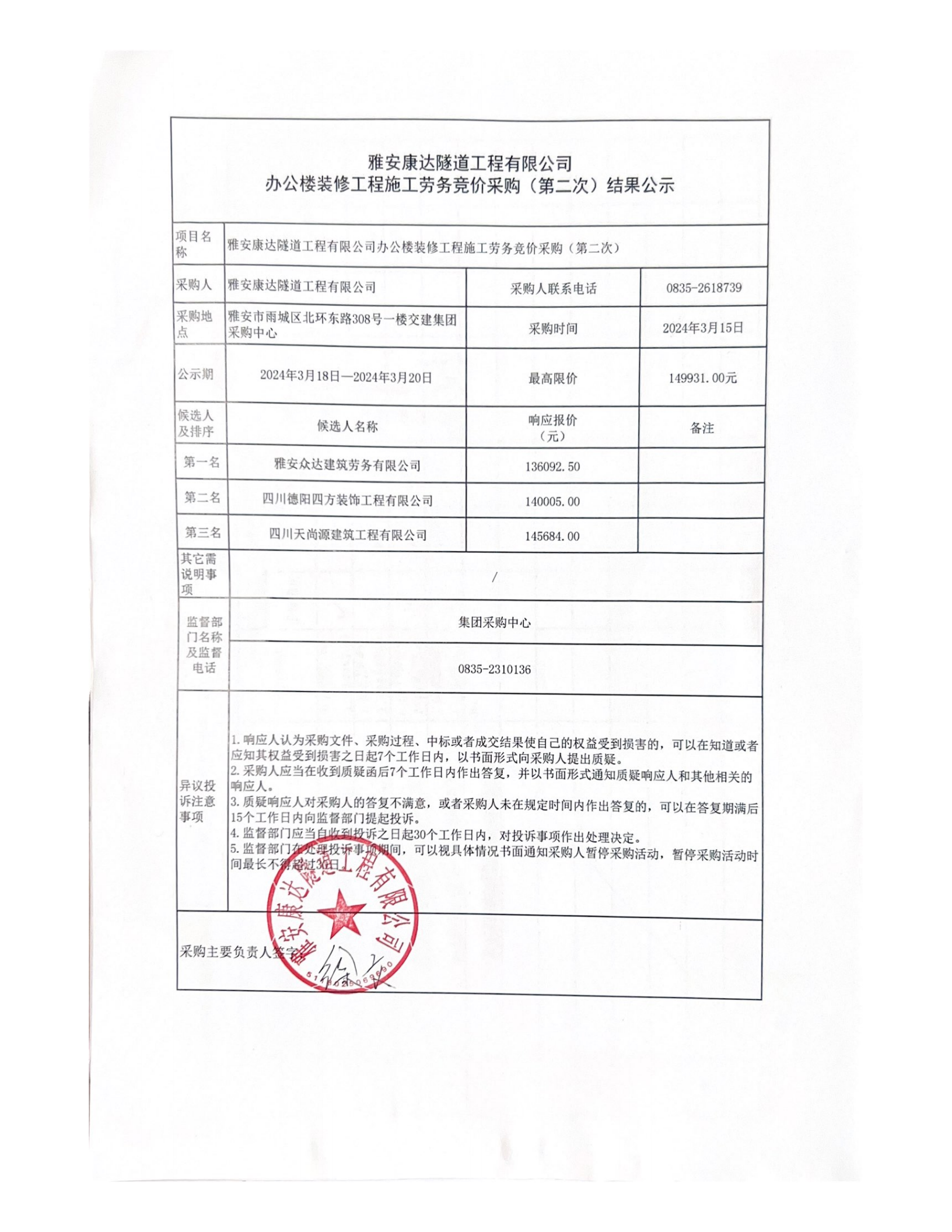 雅安康達(dá)隧道工程有限公司辦公樓裝修工程施工勞務(wù)競價(jià)采購(第二次)結(jié)果公示