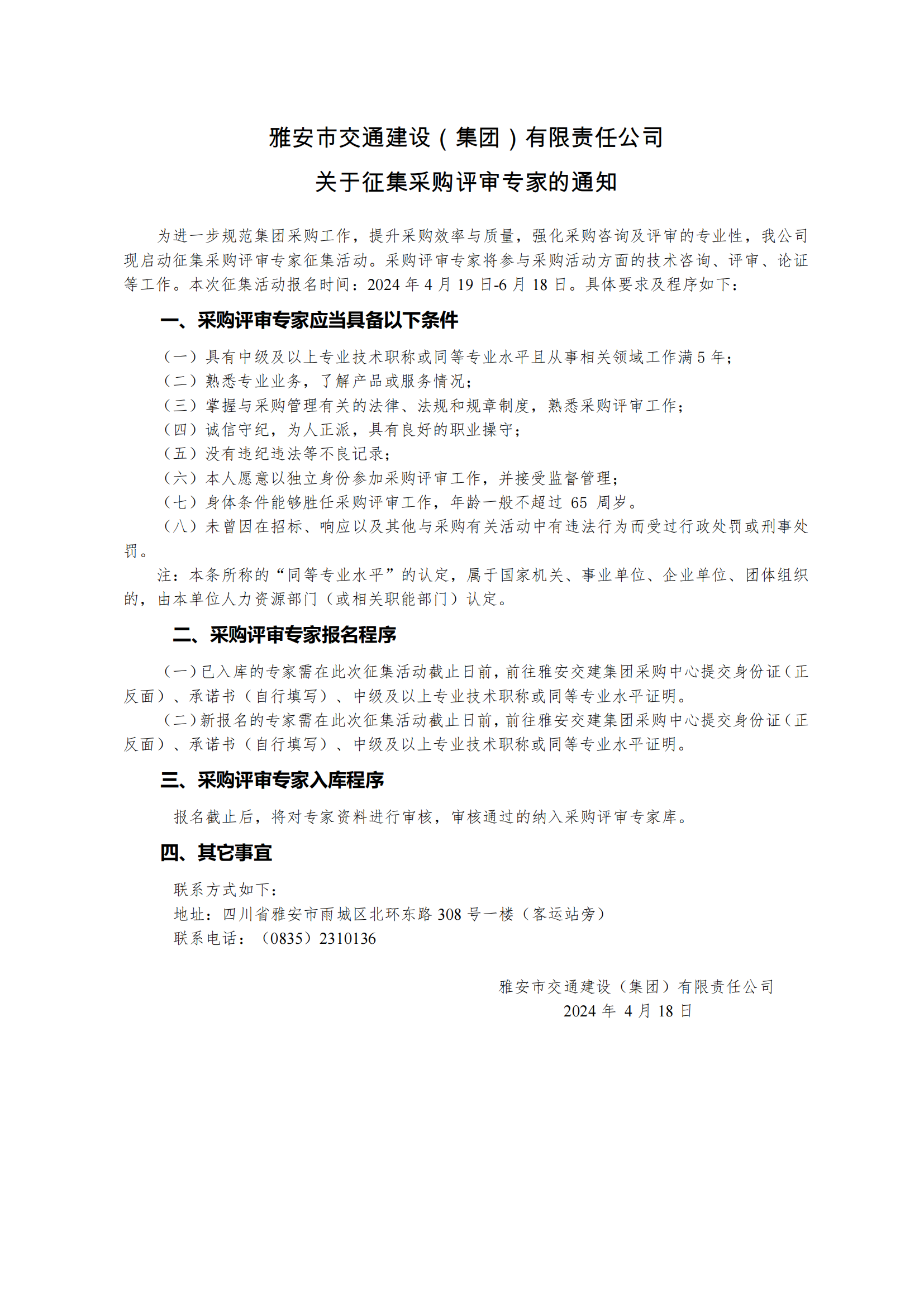 雅安市交通建設(shè)(集團)有限責(zé)任公司關(guān)于征集采購評審專家的通知