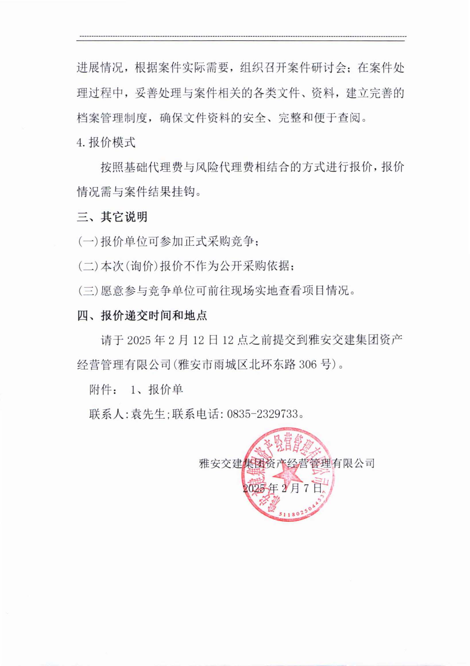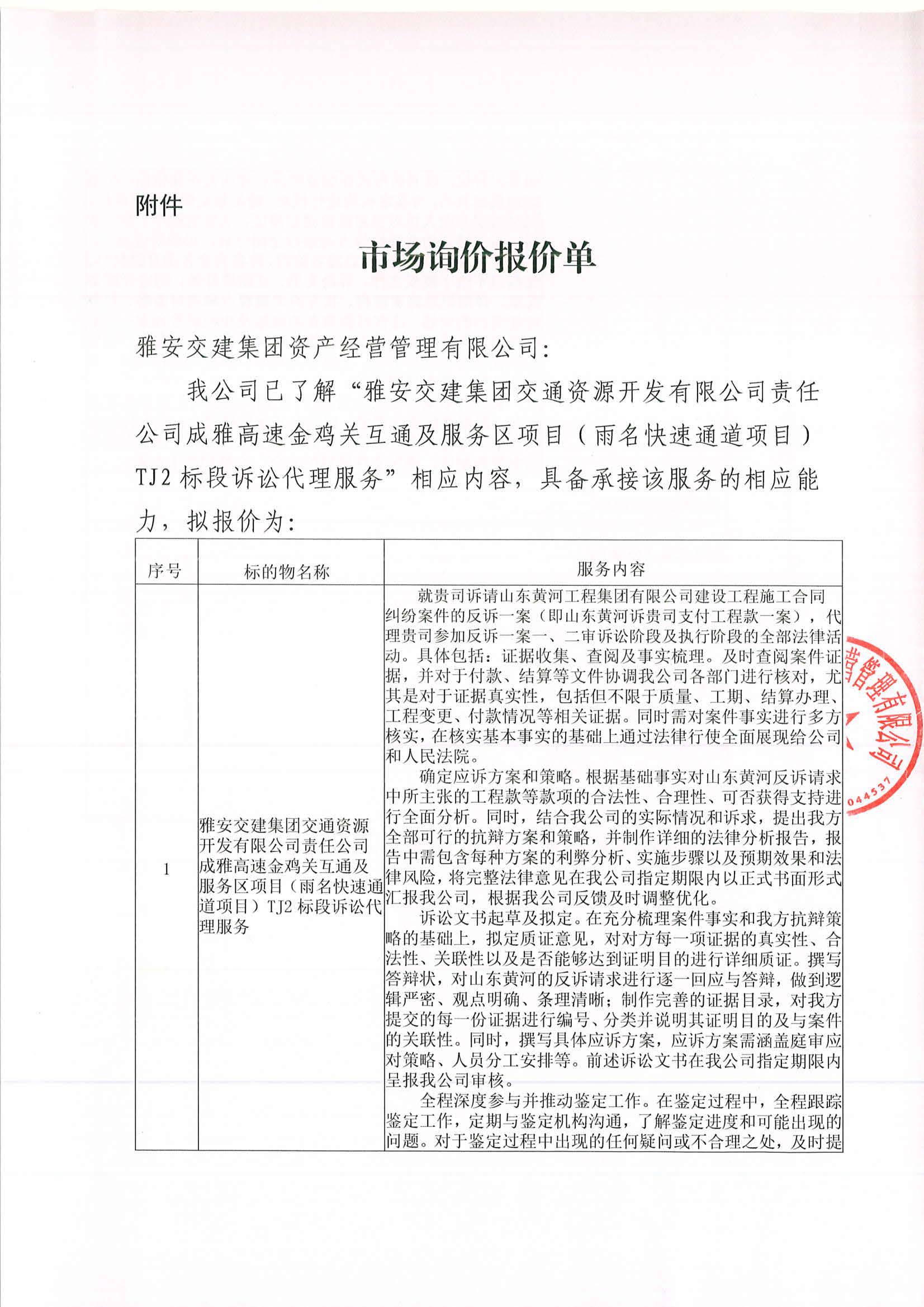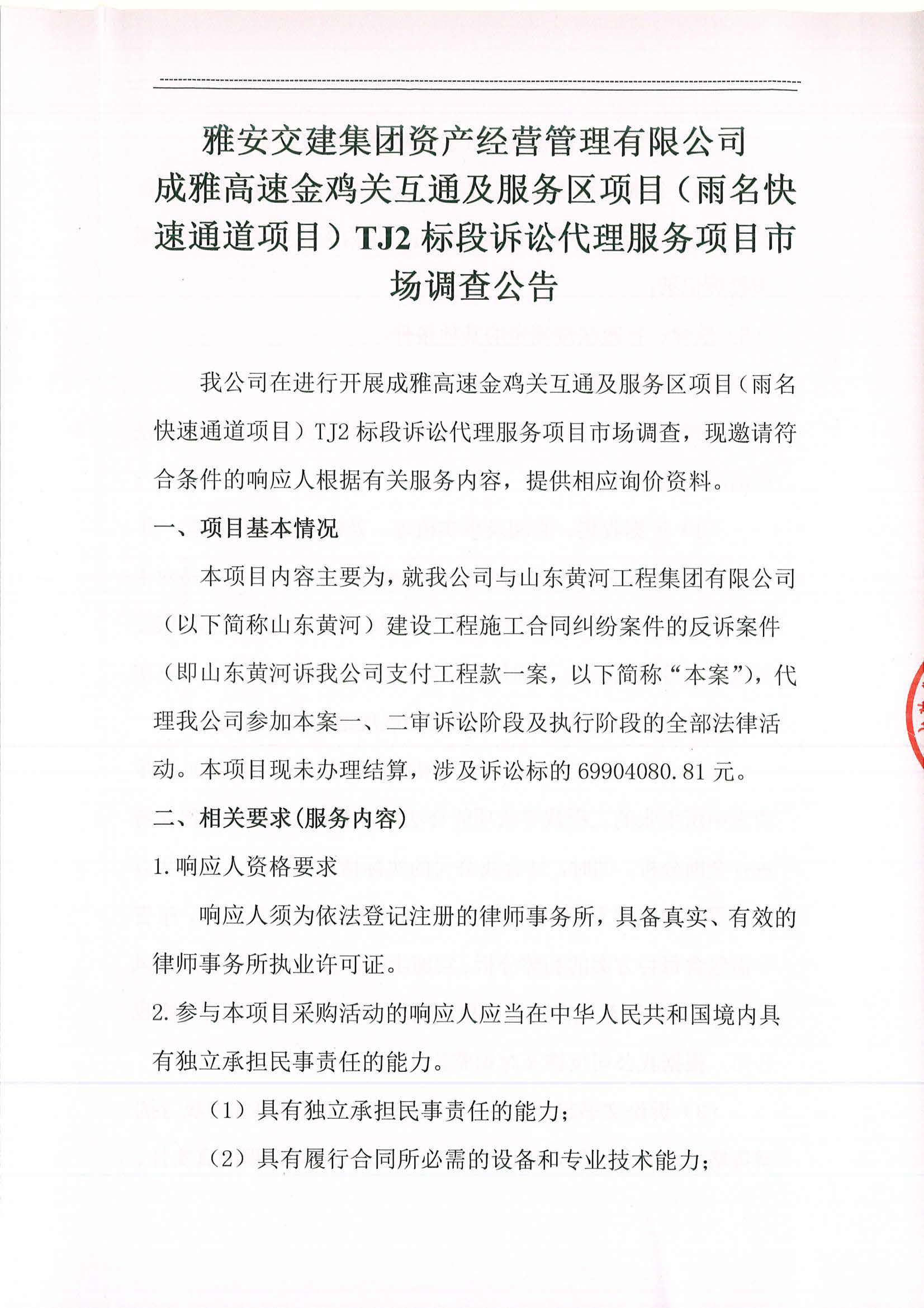 雅安交建集團資產(chǎn)經(jīng)營管理有限公司成雅高速金雞關互通及服務區(qū)項目(雨名快速通道項目)TJ2標段訴訟代理服務項目市場調查公告