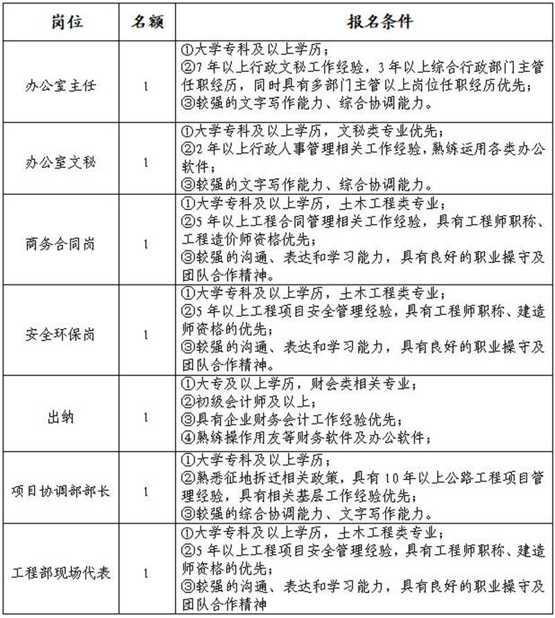 雅安交建集團(tuán)資產(chǎn)經(jīng)營管理有限公司是雅安市重點(diǎn)國有企業(yè)雅安市交建集團(tuán)下屬子公司,主要從事企業(yè)資產(chǎn)經(jīng)營管理;項(xiàng)目投資;土地整理等業(yè)務(wù)。根據(jù)公司發(fā)展需要,決定面向社會公開招聘7名工作人員,現(xiàn)將有關(guān)事項(xiàng)公告如下: