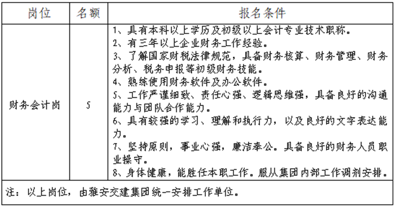 根據(jù)發(fā)展需要,決定面向社會公開招聘雅安市交通建設(shè)(集團)有限責(zé)任公司(以下簡稱“雅安交建集團”)所屬子公司財務(wù)工作人員5名,現(xiàn)將有關(guān)事項公告如下: