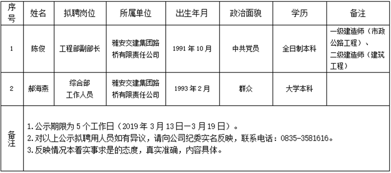 雅安交建集團(tuán)子公司擬聘用人員公示(路橋公司)